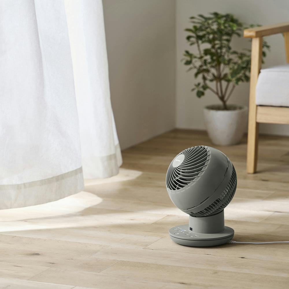 DCモーター搭載により静音性がアップしたサーキュレーターアイ DCsilentです。8段階の風量調整のうち、1~5段階までが一般的に静音と言われる35dB未満です。寝室や書斎など、使用シーンに合わせた細やかな風量の調節が可能です。特殊形状スパイラルグリル・ボール型フォルムを採用。ジェット気流効果により、コンパクトでもパワフルな風が届きます。静音~ターボの8段階の風量調整が可能で、使用シーンに合わせてお好みの風量が選べます。自動で上下左右に首を振る首振り機能付きです。