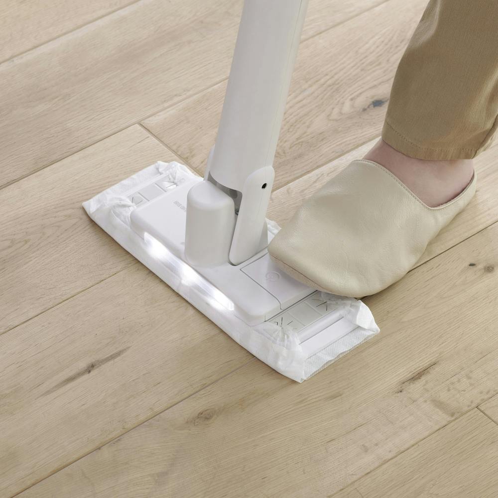 1分間に約1000回の高速振動で床をこすり、汚れをラクに落とすことができます。市販の使い捨てシートを使用でき、モップの水洗いの手間も省け、衛生的です。(シートは付属していませんので、別途ご購入ください。推奨シートサイズ:200×280mm以上)。LEDライト付き!家具の下などのゴミが見えずらい場所や床に付着した皮脂やキッチンの油汚れなどライトで照らすことで、汚れを逃さず拭き掃除をすることができます。電源のON/OFFは足元のボタンを押すだけです。