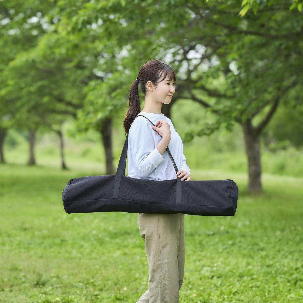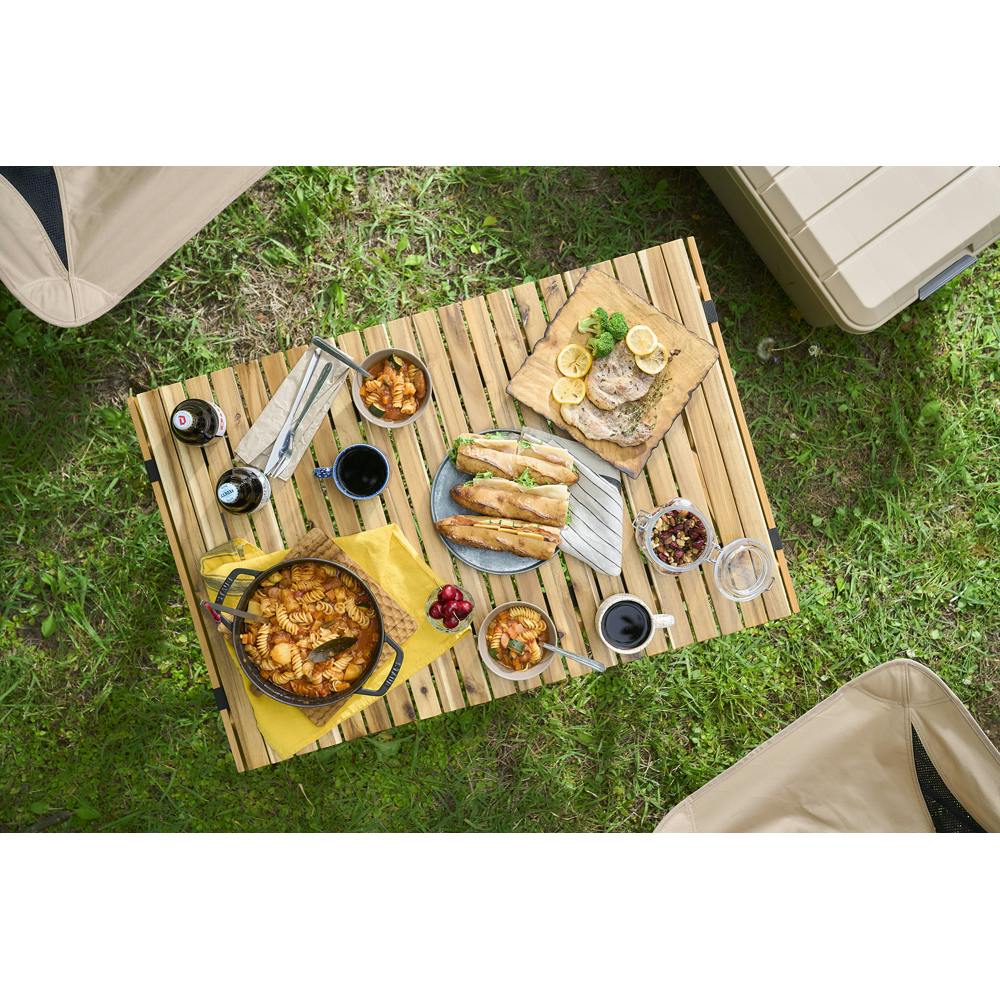 高級感のあるアカシア材の天然木を天板に使用したウッドロールテーブルです。濃淡のある色合いで天然木のあたたかな雰囲気を楽しめます。天面の高さが約44cmとロースタイルキャンプにちょうどいい高さです。脚を開いて天板をはめるだけで簡単に組み立てられます。傷防止の仕切り付き収納袋が付いています。脚部にカバーが付いているため、屋内でも使用可能です。 ●収納時サイズ(約):92×20×19cm(収納袋込み) ●耐荷重(約):30kg