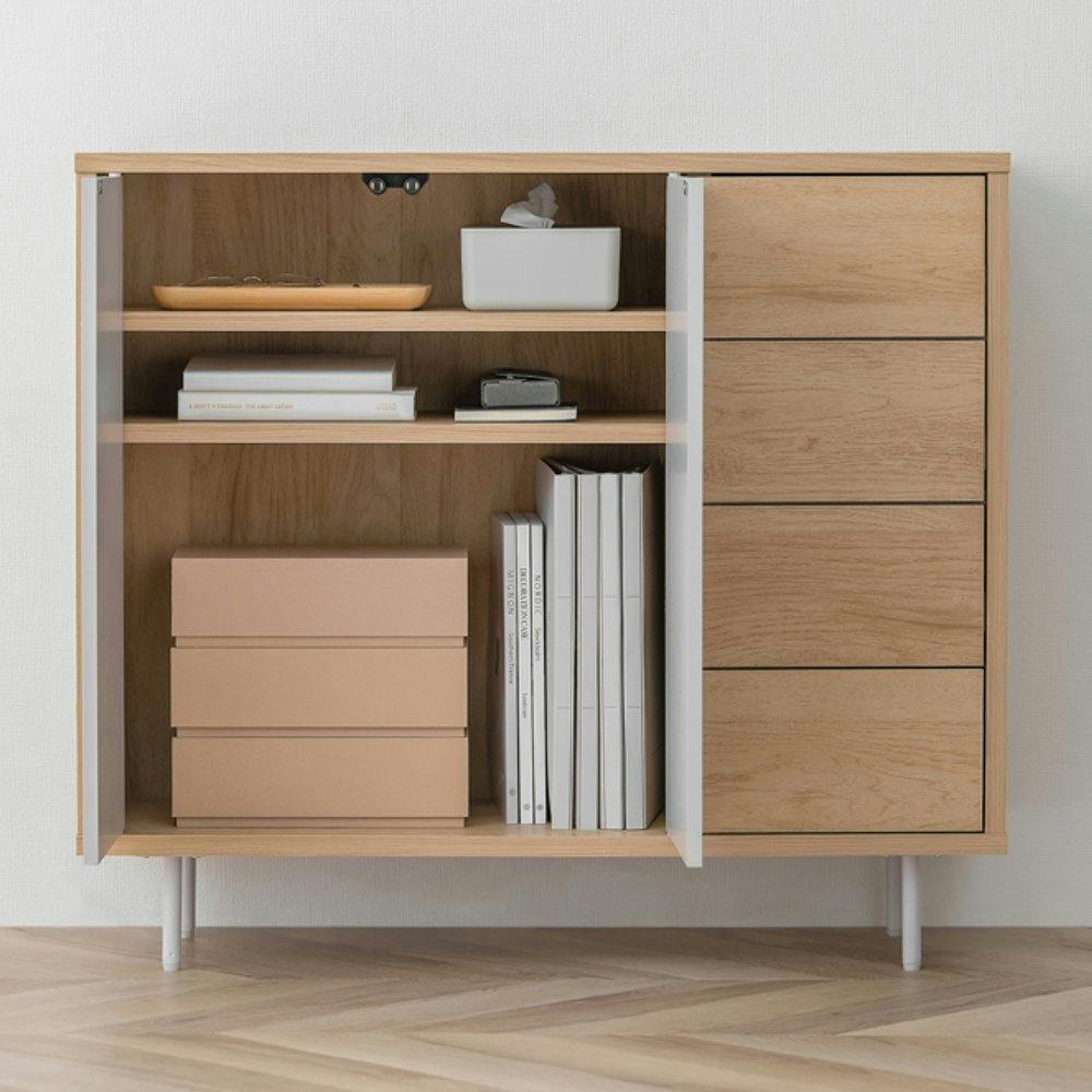 お部屋を広く魅せる奥行きがスリムなリビングキャビネットです。扉はグレーの化粧紙でアクセントをプラスし、木目調の板はインテリアに馴染みあたたかな雰囲気を演出します。収納は扉付きと引き出しの2種で抜群の収納力です。マグネットを採用し、ワンタッチで簡単に開閉することができます。取っ手がなくすっきりとした印象を与えます。扉付き収納は高さを調節できる可動棚が2枚付けられます。約3.2cm間隔で11段階可動でき収納物に合わせて調整できます。脚部はアジャスター付きで、がたつきを防止します。