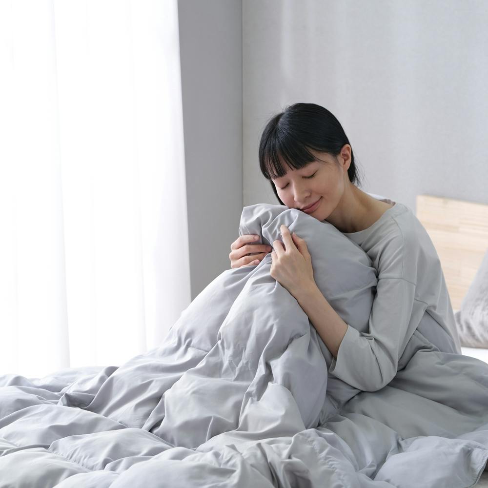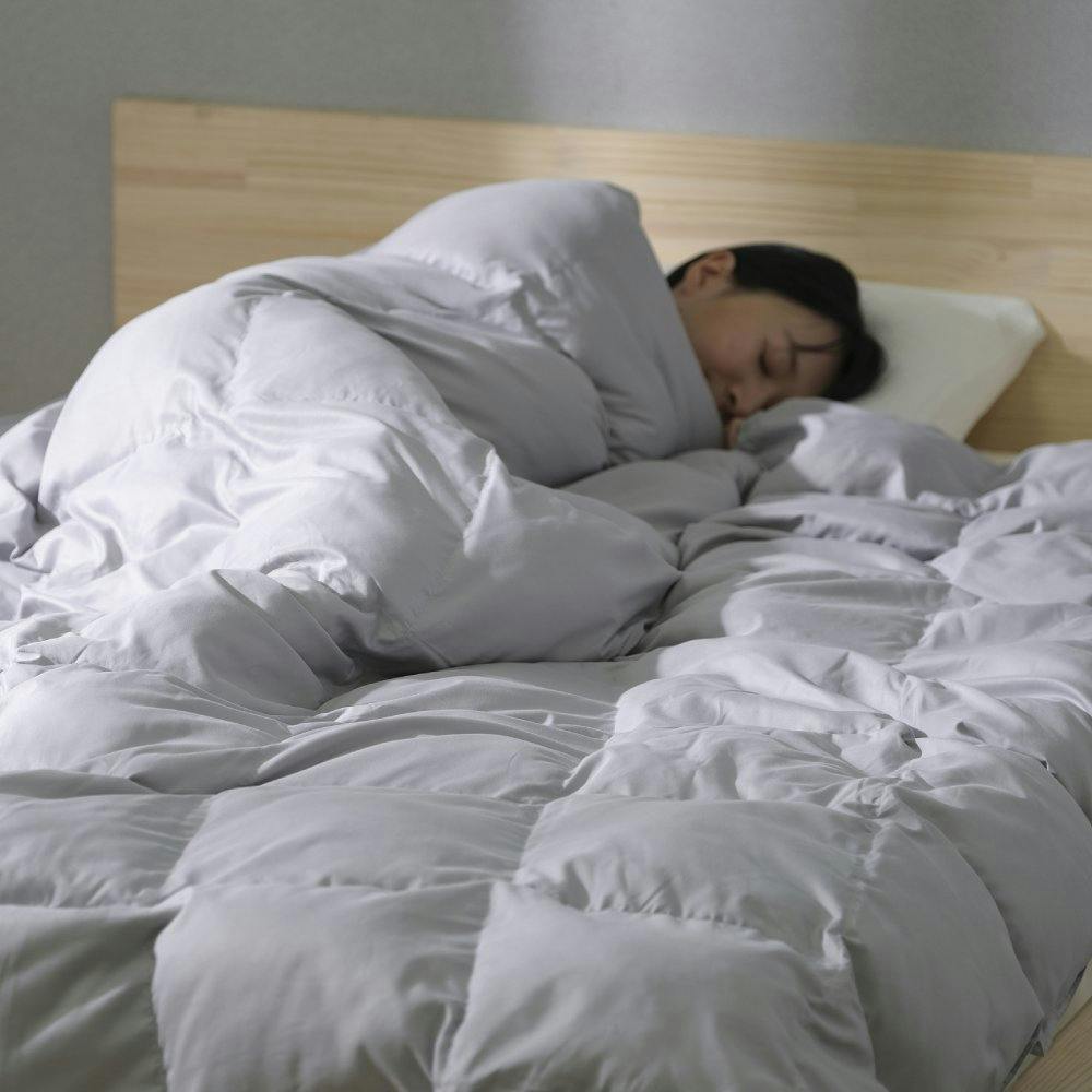 羽毛特有のにおいがなく、動物性アレルギーもなく安心してお使いいただけます。側生地は桃の皮の表面のような風合いを持つピーチスキン加工で、柔らかくなめらかな肌触りです。ループ付きで掛けふとんカバーとのズレを防ぎます。手洗い可能です。 ●目付け(約):側生地:88g/平方メートル ●詰め物重量(約):1.3kg ●ループ数:6か所