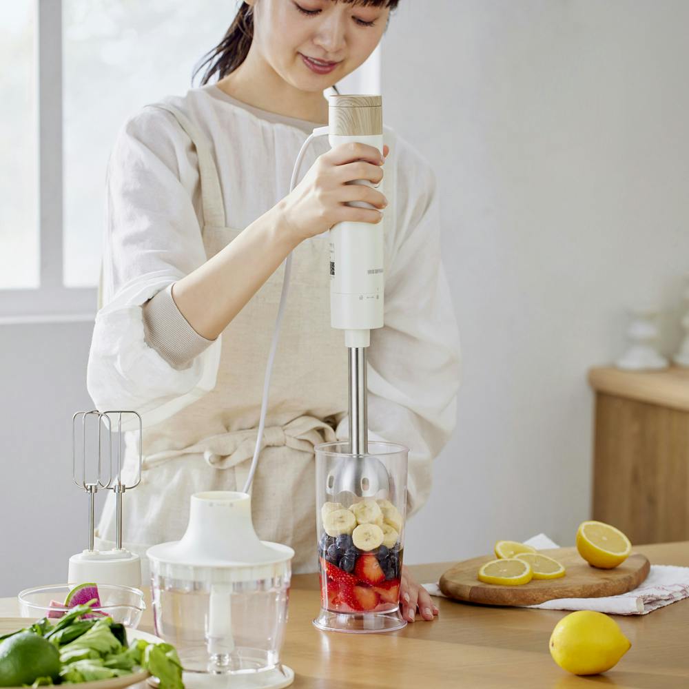 「まぜる」、「つぶす」、「きざむ」、「泡立てる」が、これ一台でできるハンドブレンダーです。ブレンダー、泡立て器、チョッパーのアタッチメント3種付きです。泡立て器は、当社初のツインビーター搭載で、泡立て時間を従来品と比較して約4割短縮できます。※生クリームが9分立てになるまでの時間を従来品(IHB-SC502)と比較。使用する食材や環境により泡立て時間は異なります。
