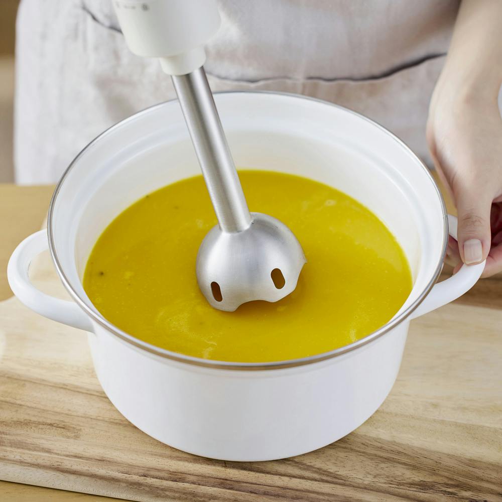 ブレンダー容器に入れて材料をつぶしながらまぜたり、直接なべに入れて調理できる(火からおろし、粗熱を取ってください)ので、ミキサーなどを使う手間が省けます。ブレンダー容器は少量のスムージーやドレッシング、離乳食などを作るのに便利です。作りたい料理に合わせて低速~高速までスピード調節ができます。柔らかいものは低速で、ペーストを作りたいときは高速がおすすめです。