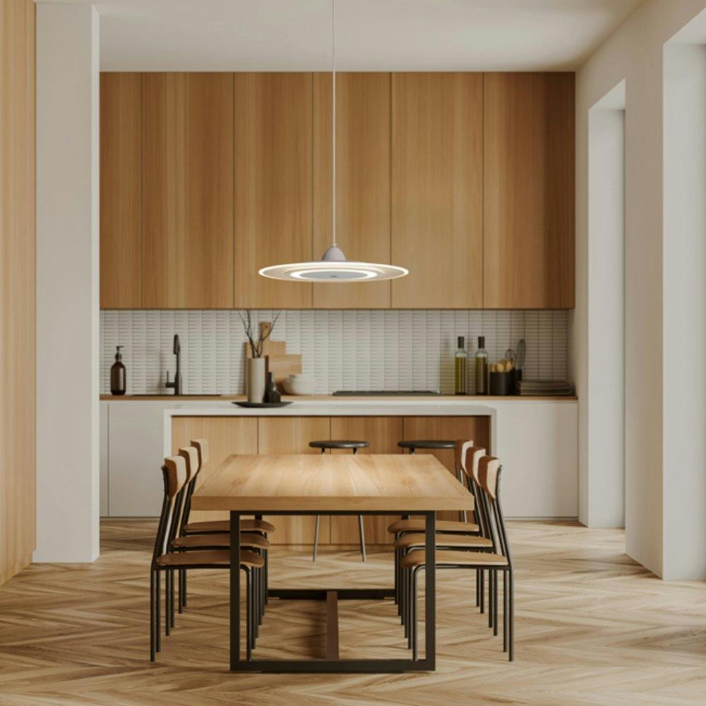 薄くてすっきりコンパクト、シンプルなデザインでどんな部屋にも最適なLEDペンダントライトです。導光パネルにより均一に発光するため、まぶしさを感じにくく、目に優しいです。勉強や作業など集中したいときにおすすめの昼光色タイプと、食事などゆっくりしたいときに適した温白色タイプの2ラインアップです。直下方向の光源も搭載することで、ダイニングテーブルや直下方向も適切な明るさで照らします。