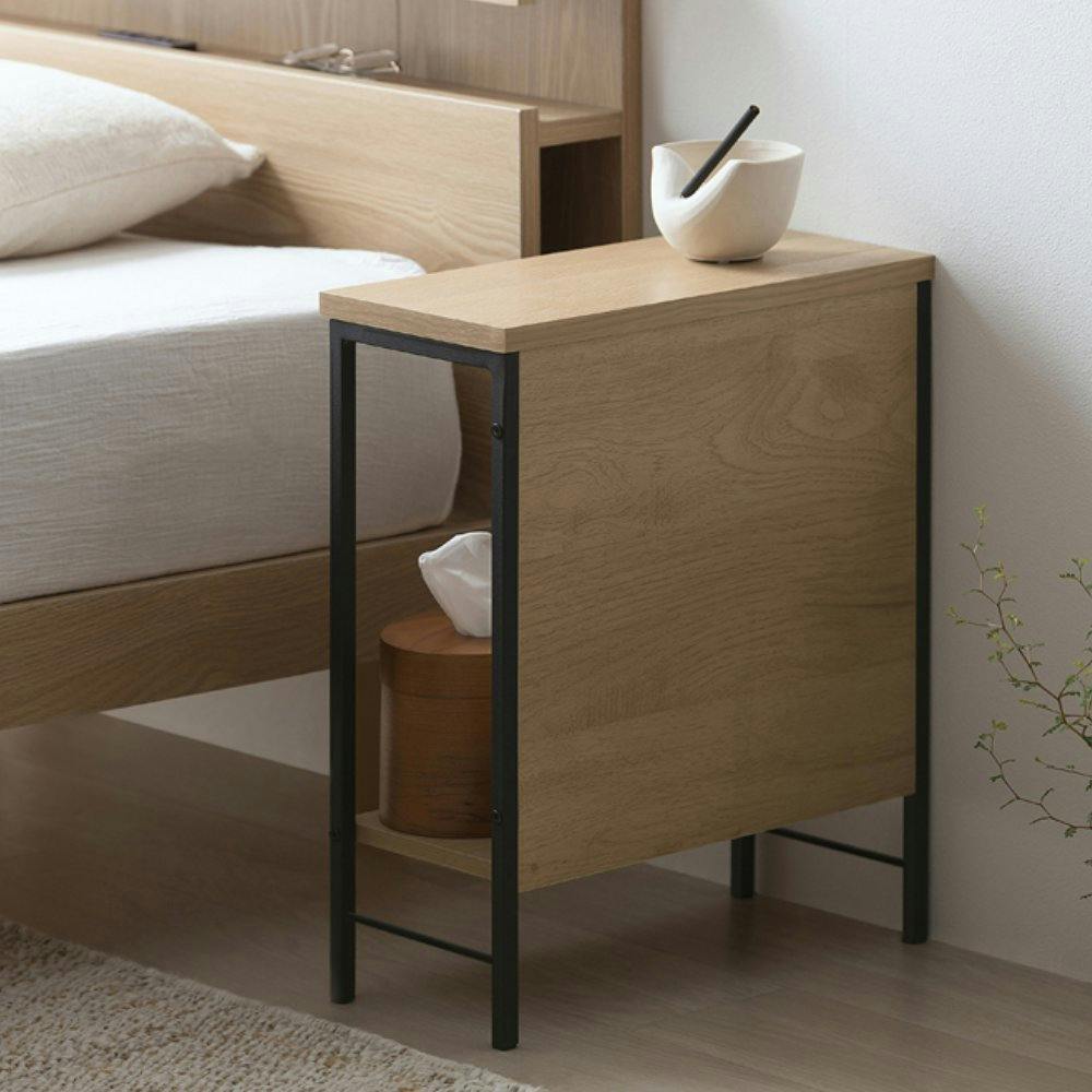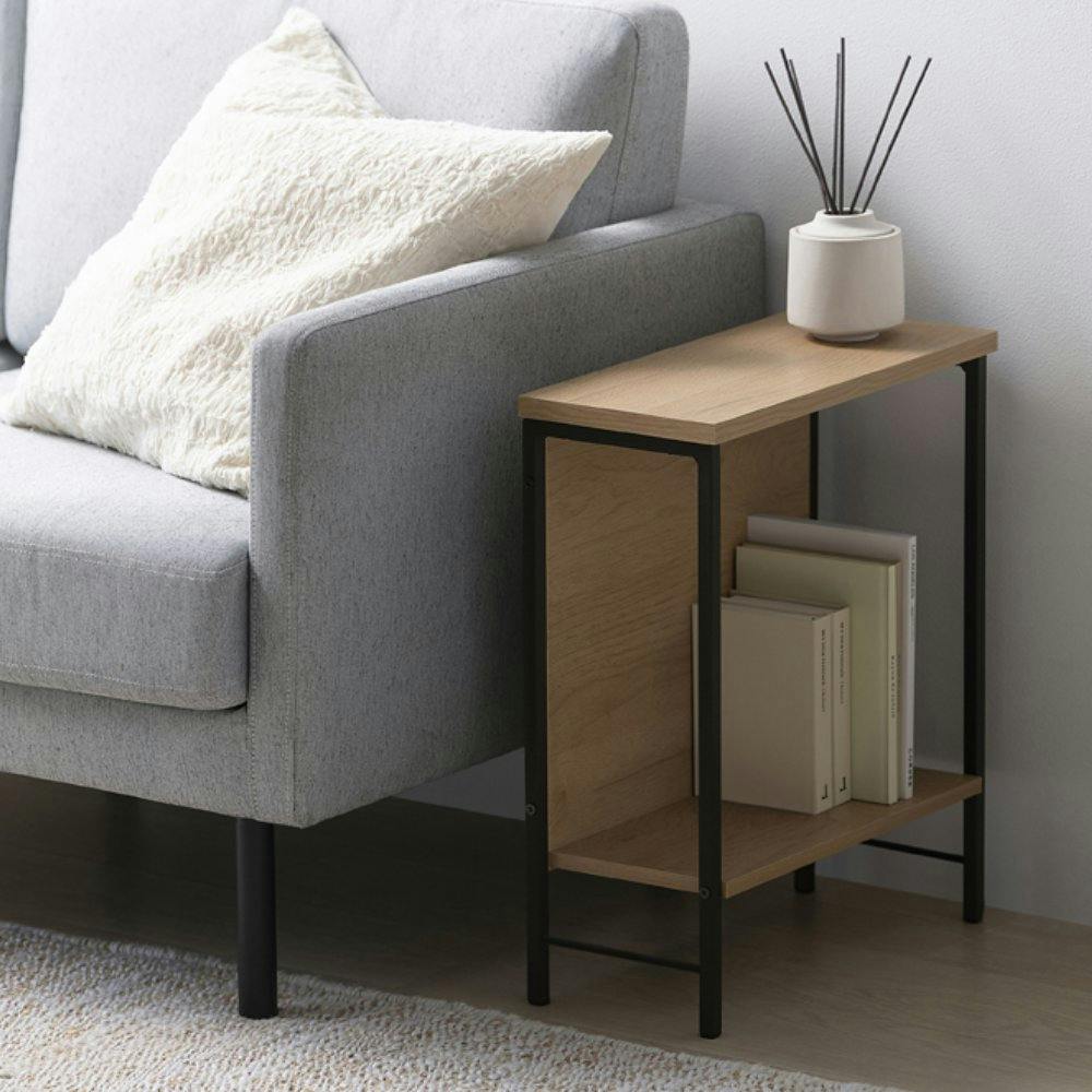 魅せる収納と隠す収納、どちらも兼ね備えたサイドテーブルです。約18cmの奥行きスリムな設計で空間を広く使えます。ブラックスチールとあたたかな木目調の木材の組み合わせで、スタイリッシュなお部屋を演出します。本や小物などが収納できる棚板付きです。背板があるため書籍も置けます。背板があるため設置場所に応じて、外側からは見えにくく、使用面はオープンで使いやすくなっています。ベッドサイドやソファ横、玄関など場所を選ばずお使いいただけます。お客様組み立てとなります。