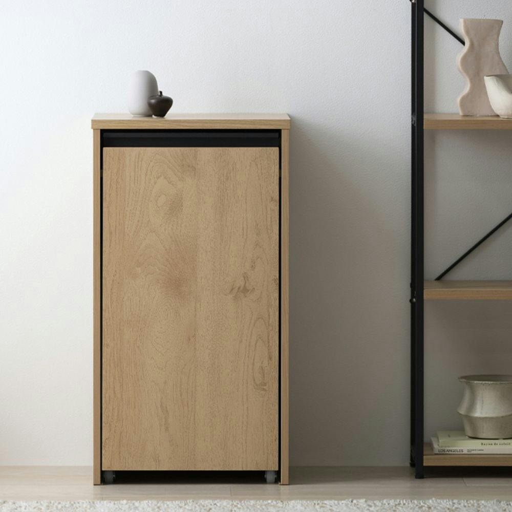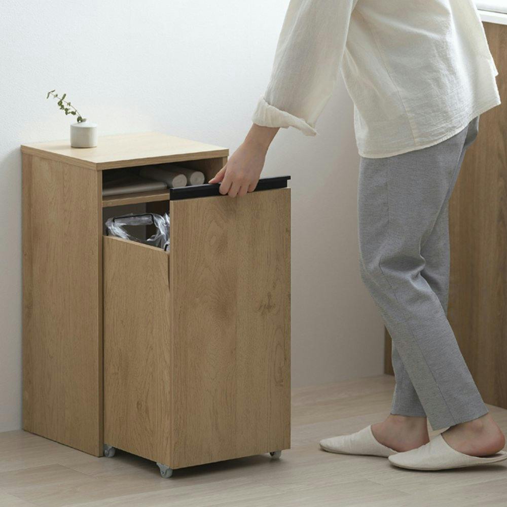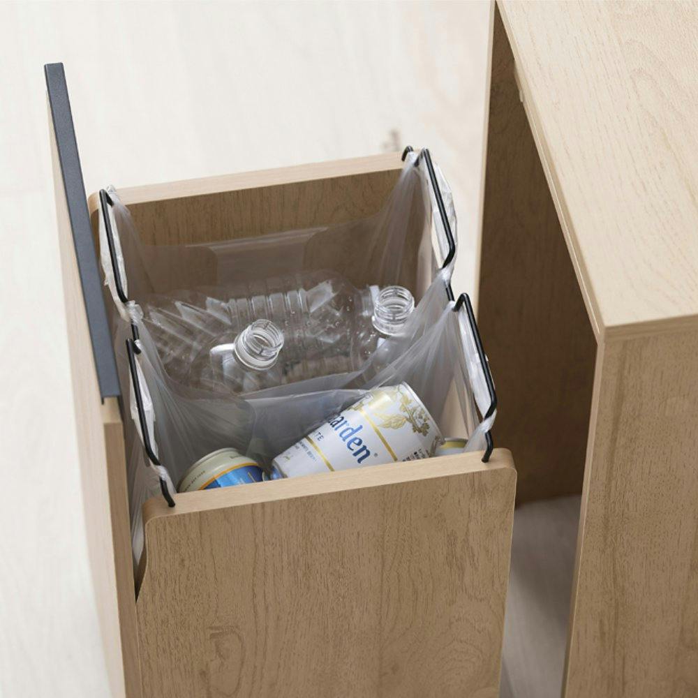 生活感を隠せるデザインのダストワゴンです。約29.6cmの奥行きスリムな設計で空間を広く使えます。ブラックスチールの取っ手とあたたかな木目調の木材の組み合わせで、スタイリッシュなお部屋を演出します。フックにごみ袋を掛けて使用します。大きい袋を掛けることも、2つ掛けて分別することもできます。天板はメラミン樹脂加工で、熱や水に強く安心してお使いいただけます。天板下にはごみ袋や清掃用品などの小物が収納できる棚板付きです。