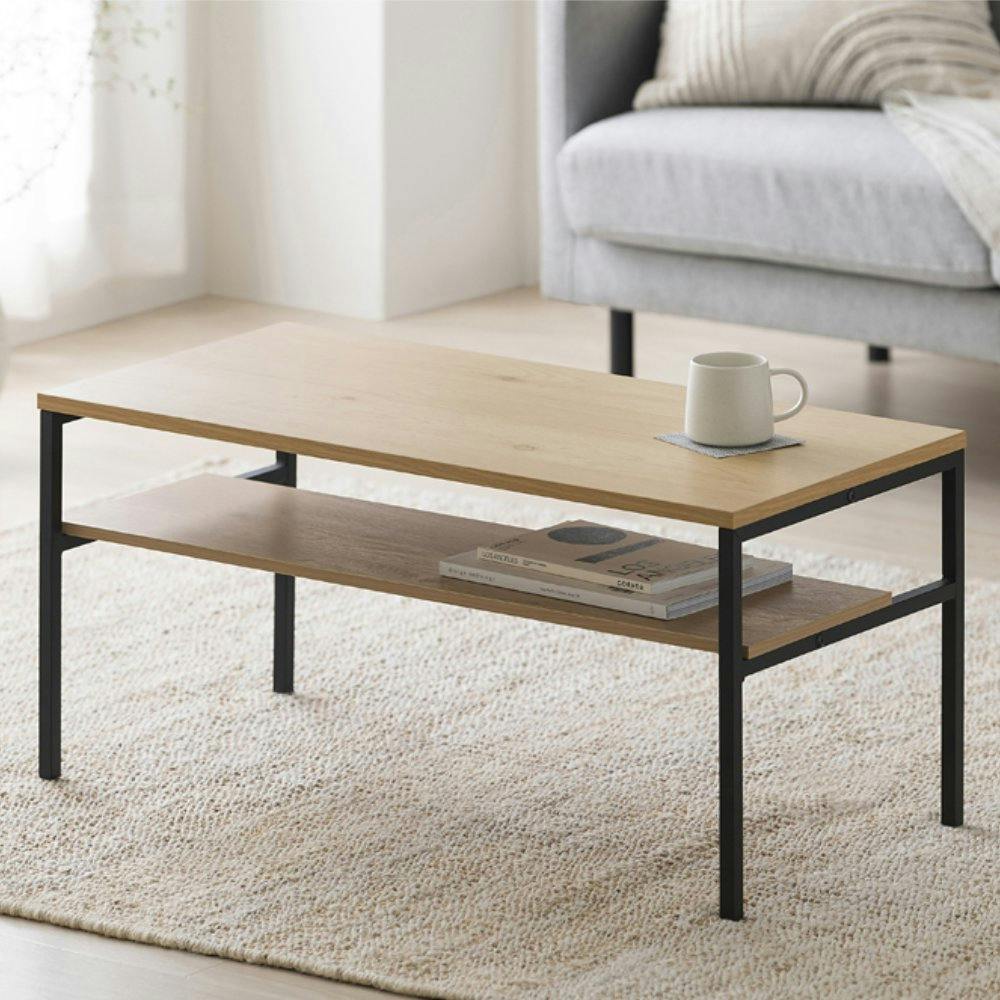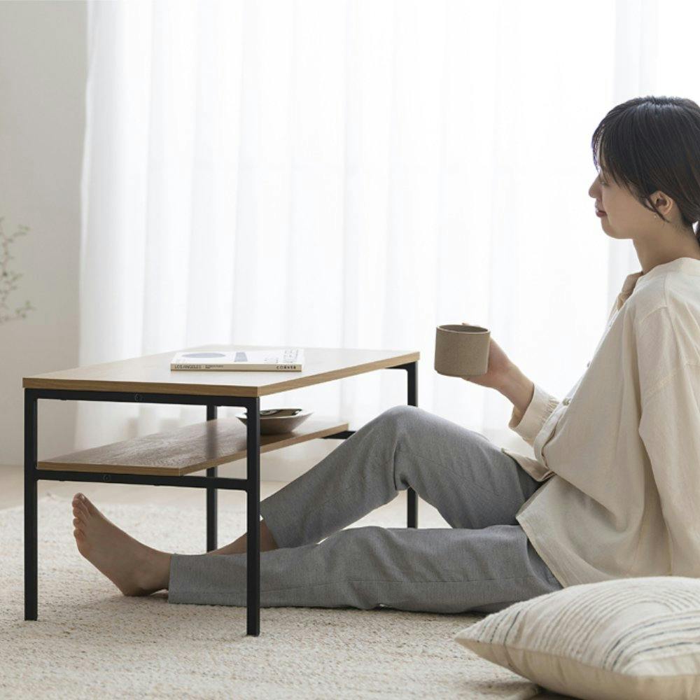 使いやすい幅とスリムな奥行きのセンターテーブルです。約39.5cmの奥行きスリムな設計で空間を広く使えます。ブラックスチールとあたたかな木目調の木材の組み合わせで、スタイリッシュなお部屋を演出します。ノートパソコンやちょっとした作業をするのに使いやすい天板サイズです。天板はメラミン樹脂加工で、熱や水に強く安心してお使いいただけます。本やリモコン、小物などが収納できる棚板付きです。棚板を片側に寄せることで、座る際に脚を入れやすい設計にしています。お客様組み立てとなります。