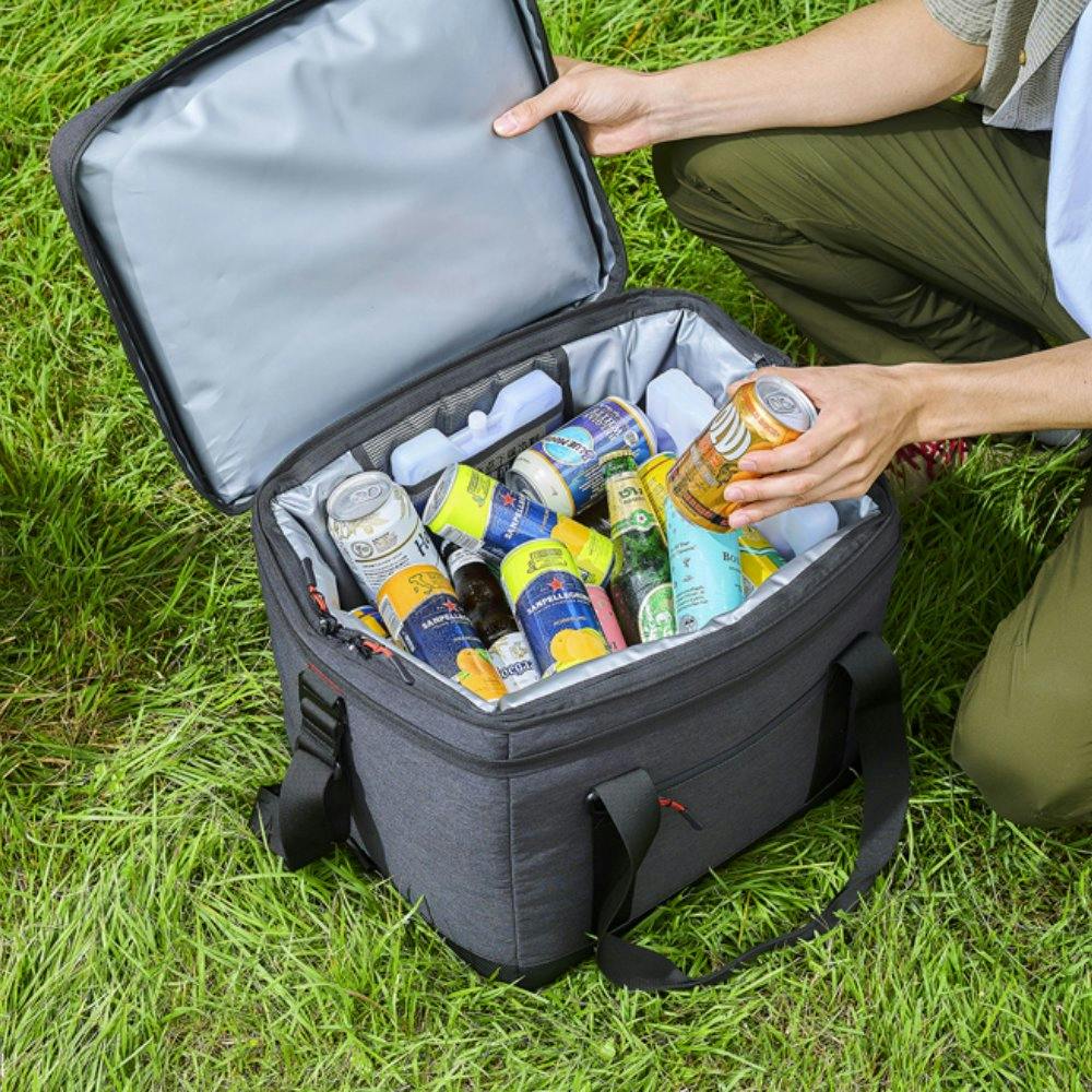 コンパクトに折りたためるので、持ち運びや収納にとても便利です。庫内に保冷剤を収納できるポケット付きです。(【※】当社ソフトクーラーボックス保冷性能の自社基準において。本体容量40%相当の氷を入れ、底面温度が8℃に達するまでの日数 (環境温度:30℃9時間・20℃15時間の繰返し)。) ●最大収納容量目安:500mlペットボトル27本、2Lペットボトル7本 ●容量(約):25L ●収納サイズ(約):390×340×260mm