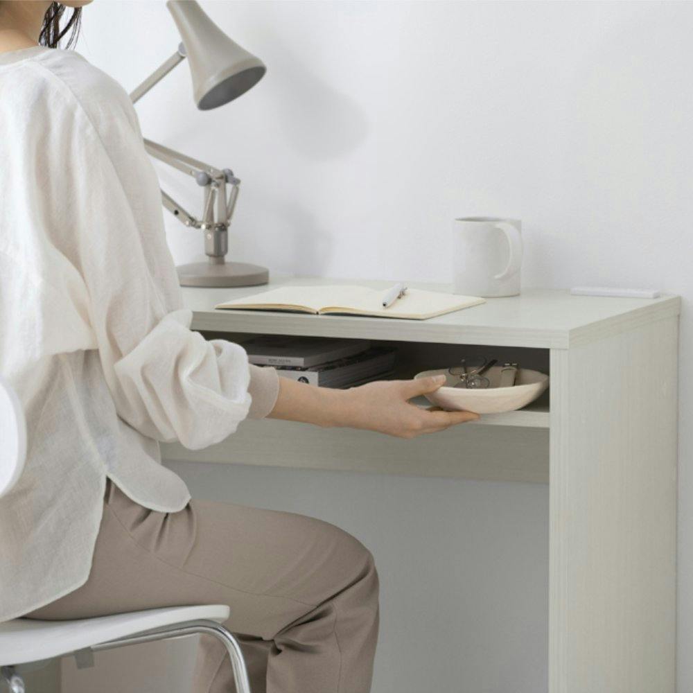 使いやすい幅とスリムな奥行きのデスクです。ノートパソコンやちょっとした作業をするのに使いやすい天板サイズです。A4サイズのノートも広げられます。リモコンやティッシュなどを収納できる棚付きです。2口コンセント付きで、ノートパソコンでの作業も可能です。お客様組み立てとなります。