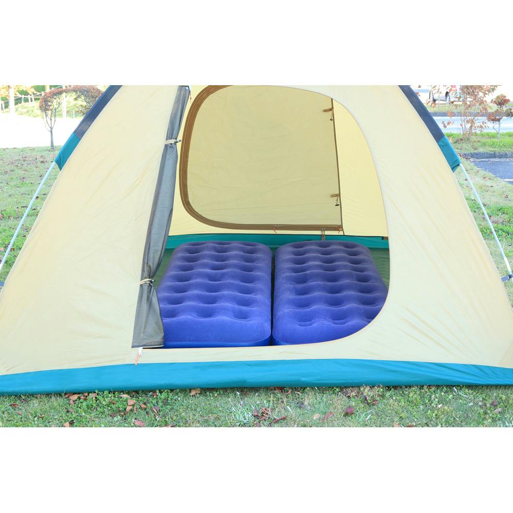 防災用品やレジャー用品として使用できる簡易エアーベッドです。簡単設置、コンパクト収納、いざという時すぐ使えます。肌触りがよい表面加工と、厚さ22cmのボリュームで固い床でも底付き感を感じずに眠れます。専用ポンプで女性でも簡単に膨らませることができます。(押しても引いても空気が入るダブルアクションタイプです)