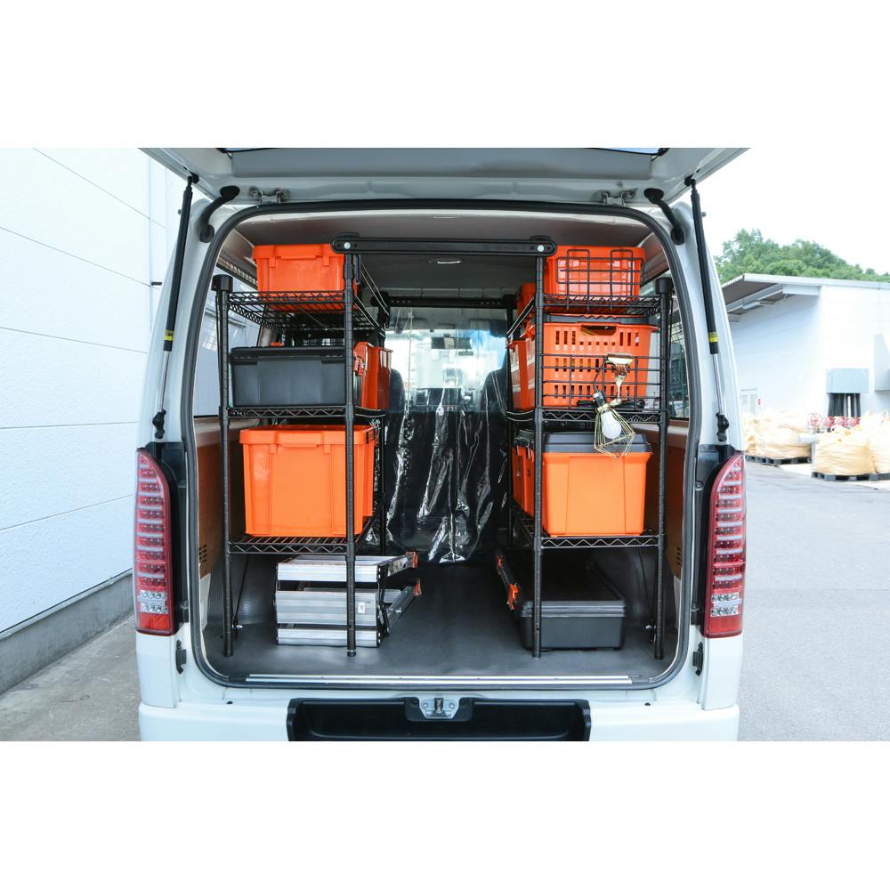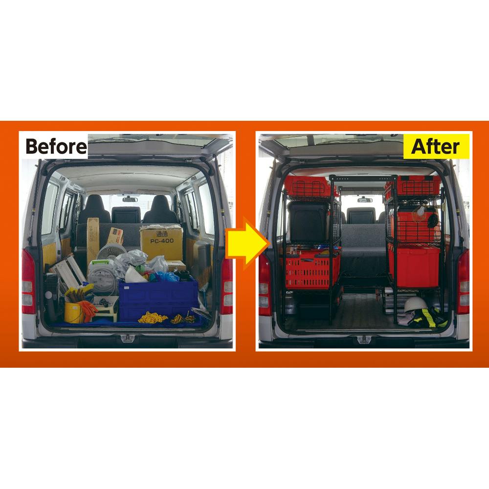散らかりがちな工具や資材などの仕事道具をすっきりと収納することができる専用ラックです。2台のラックは高さを自由に変えることができるので、収納する物に合わせて調整することができます。ラックの間には通路があるので、収納物の出し入れもスムーズです。車載ラックシリーズの収納ツールを使用することで、より使いやすくなります。
