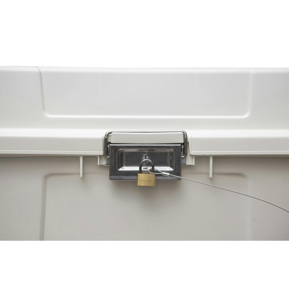 容量69Lとたっぷり入るので、大きい荷物も保管できます。フタの内側にパッキン材が付いているので、水・ホコリの侵入に強く、ステンレスバックルで丈夫なので、屋外収納としても使用できます。盗難防止の南京錠とワイヤーが付属されています。