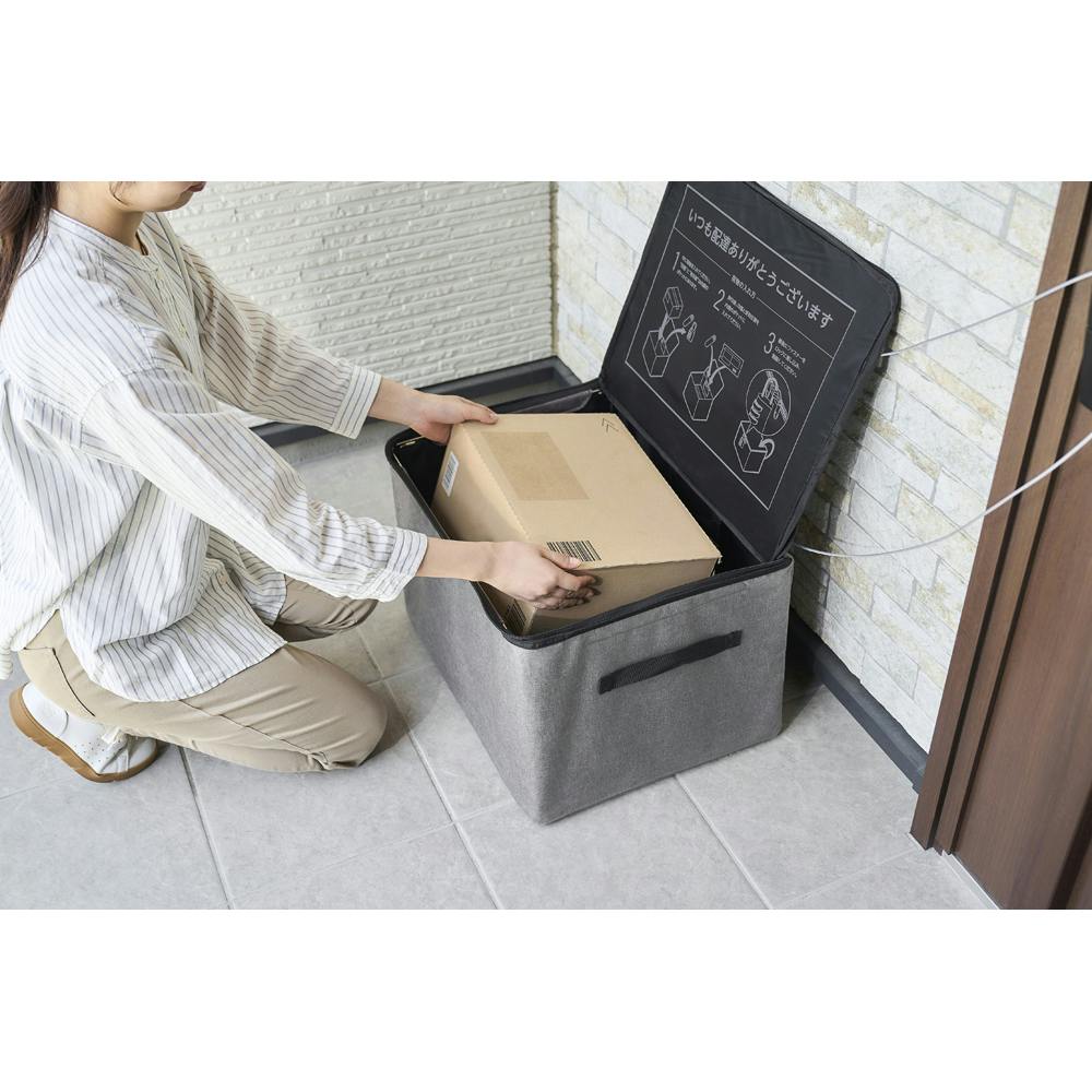 内側のフレームを立ち上げ、底面の面ファスナーで固定するだけ、組み立ても簡単です。ふたの裏側に宅配業者もわかりやすい、使い方の手順イラスト付き、印鑑ポケット付きです。水や汚れに強い撥水・防水生地を採用し、水が染みにくい止水ファスナーを使用しています。2mのワイヤーとナンバーロック2個付きで、玄関のドアハンドルや柱に簡易固定、施錠が可能です。底鋲付きで直置き等で汚れやすい底面を汚れにくくします。