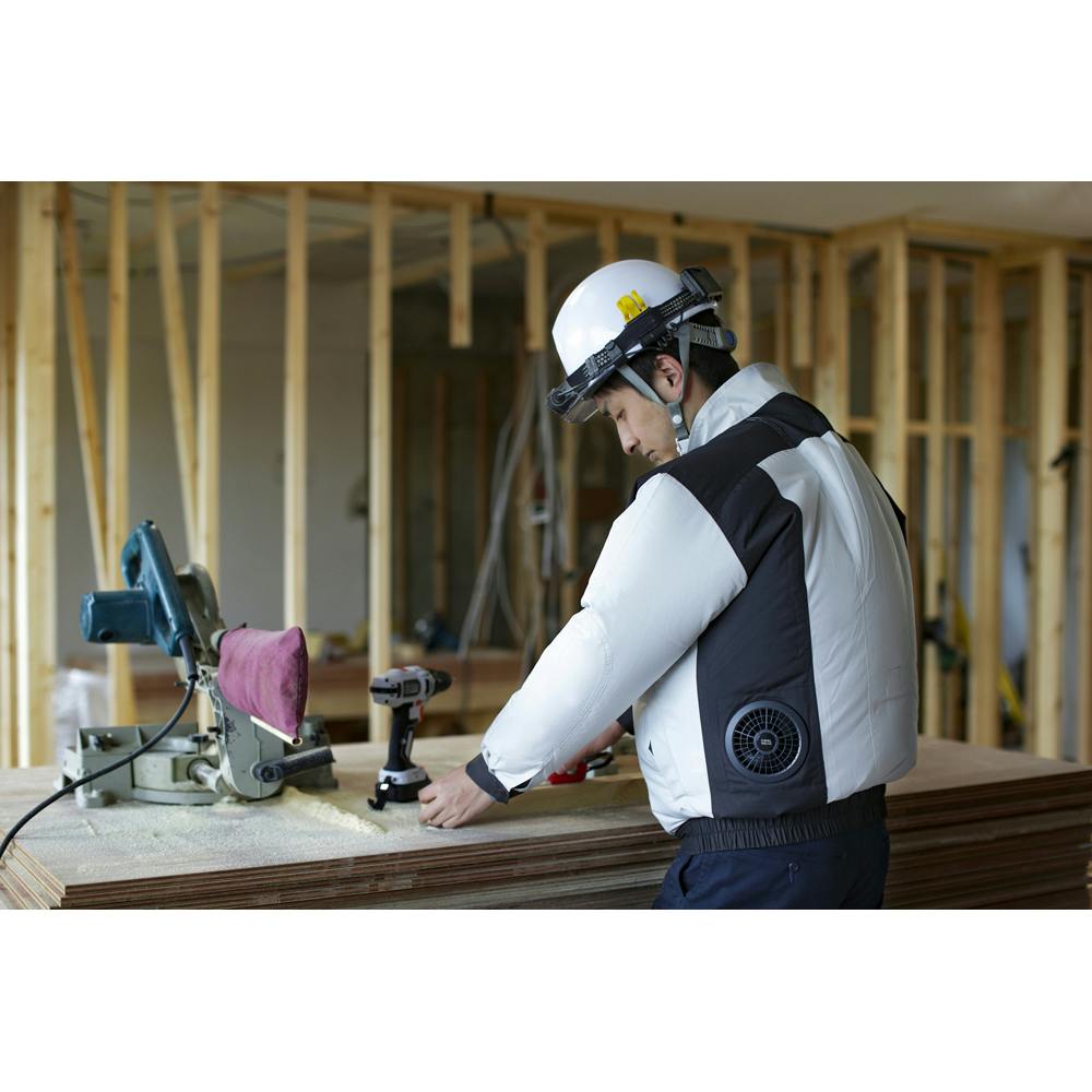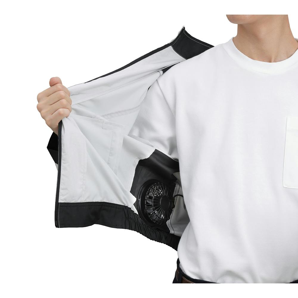 背中から首周りを効率よく涼しくできる裏メッシュデザインです。首元へ風を誘導する立体的な通気空間です。ファンが目立ちにくい配色&デザインです。専用ファン・バッテリーは別売です。