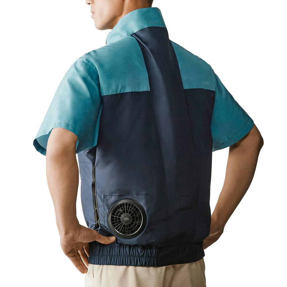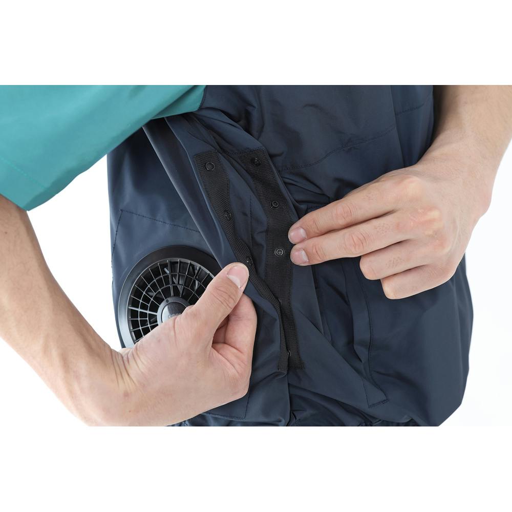 熱中症対策に最適な湿気や熱気を放出するファン付きの高機能クールウエアです。服のサイドのスナップボタンを留める事で、着用時の適度な膨らみを抑えて、動きやすいです。撥水生地を使用する事で屋外作業・アウトドアに最適です。首元へ風を誘導する立体的な通気空間です。専用ファン・バッテリーは別売です。