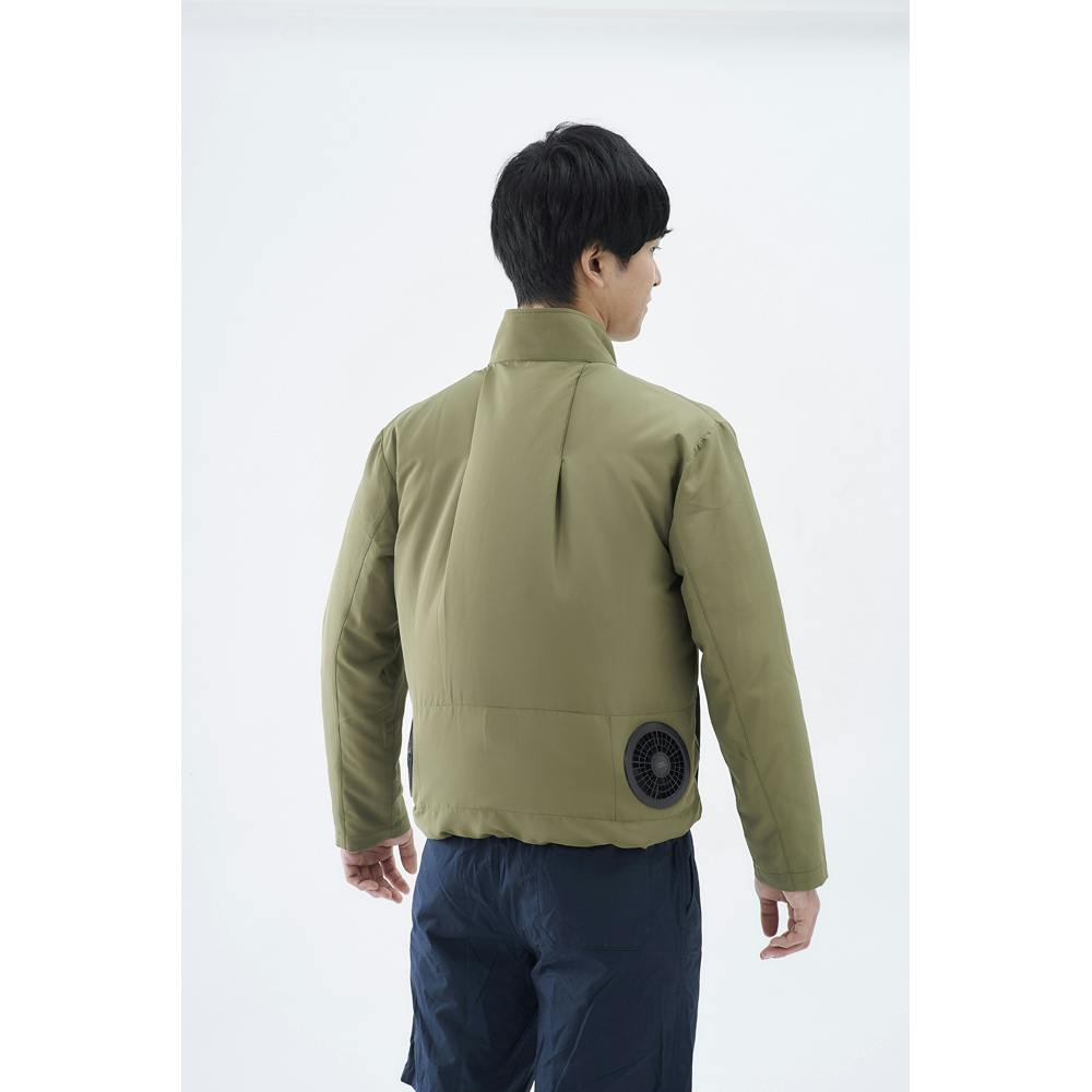 ファンは9枚羽のムラの少ない風で音を抑え、さらに薄型設計で風が体に当たりにくいです。服の裾を絞ることで、風量調整が可能です。撥水生地を使用する事で屋外作業・アウトドアに最適です。首元へ風を誘導する立体的な通気空間です。