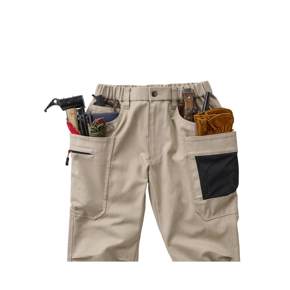 DIYやアウトドアに大活躍します。キャンプやBBQにおすすめです。難燃加工生地は燃えにくい性質のため、火の粉による穴空きを軽減します。作業道具がたくさん収まる深型多機能ポケットが7つ付いています。ファスナーポケットが1つ、スマートフォン入れ付きです。ウエストはゴム入りです。膝の曲げ伸ばしがしやすい膝立体カットで動きやすいです。ユニセックスで着用できるデザインです。