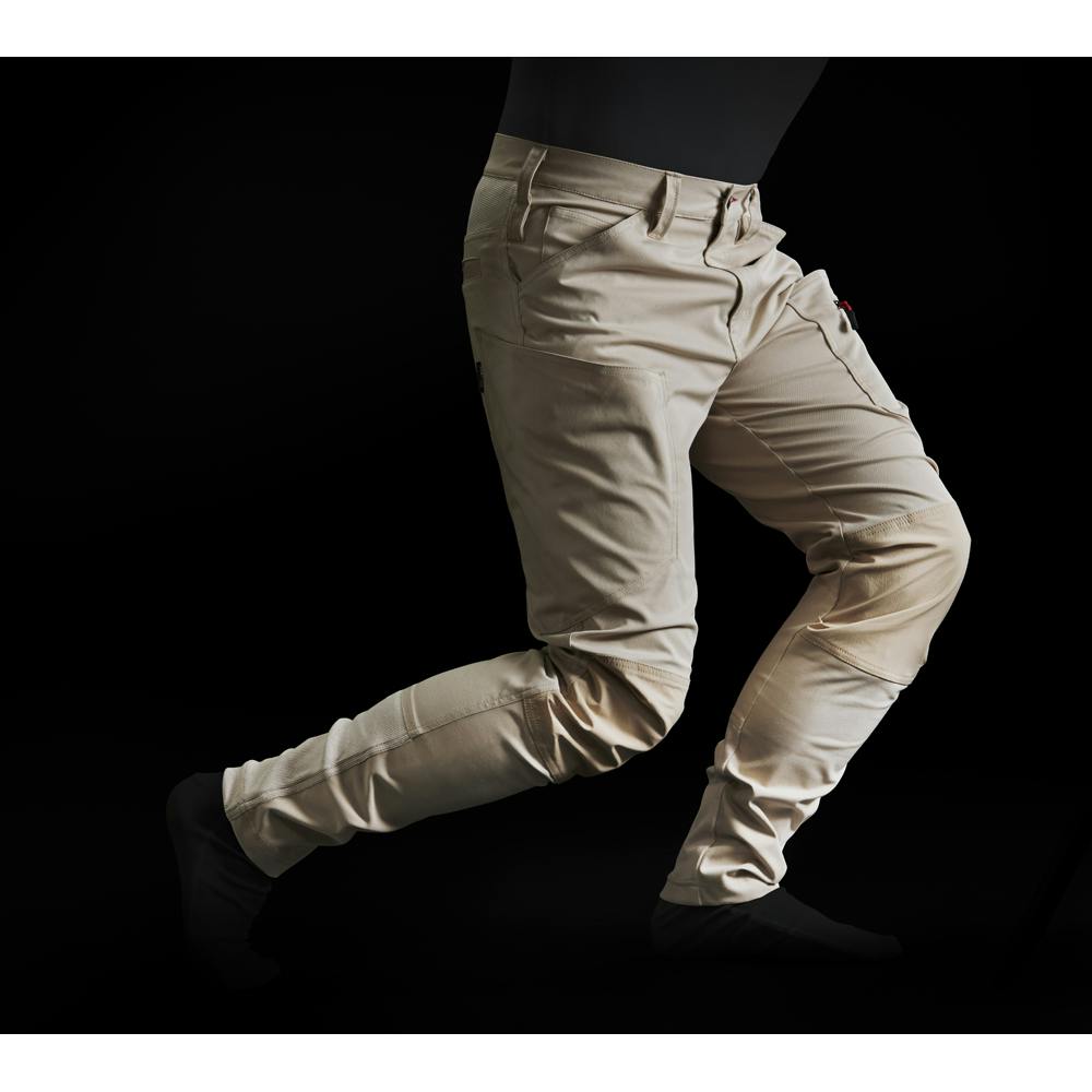 ふくらはぎ部分に伸縮性のある生地を使用しているので、ブーツ着用時の裾のもたつきを軽減します。腰部分には伸縮性のある生地を使用しているので、腰の曲げ伸ばしがラクにできます。かがんでも腰が見えないデザインです。撥水加工を施しています。深型ポケットはペットボトルが入る大きめサイズです。スマホ入れ付きです。カラビナループ付きです。ユニセックスで着用できるデザインです。