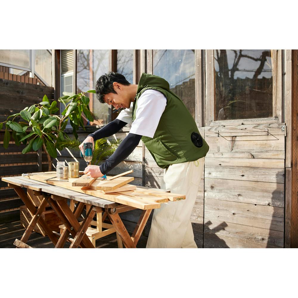 ファンから取り込んだ風が背中から首元へ抜ける立体構造です。フードを被ることで頭部にも風が通り、より涼しく感じられます。ファンは7V出力のパワフルな送風です。9枚羽のムラの少ない風で音を抑えます。UVカット99%で、夏の日差しから守ります。押しボタン式のコントローラーで3段階の風力調節が可能です。各段階で色が変わります。ユニセックスで着用できるデザインです。