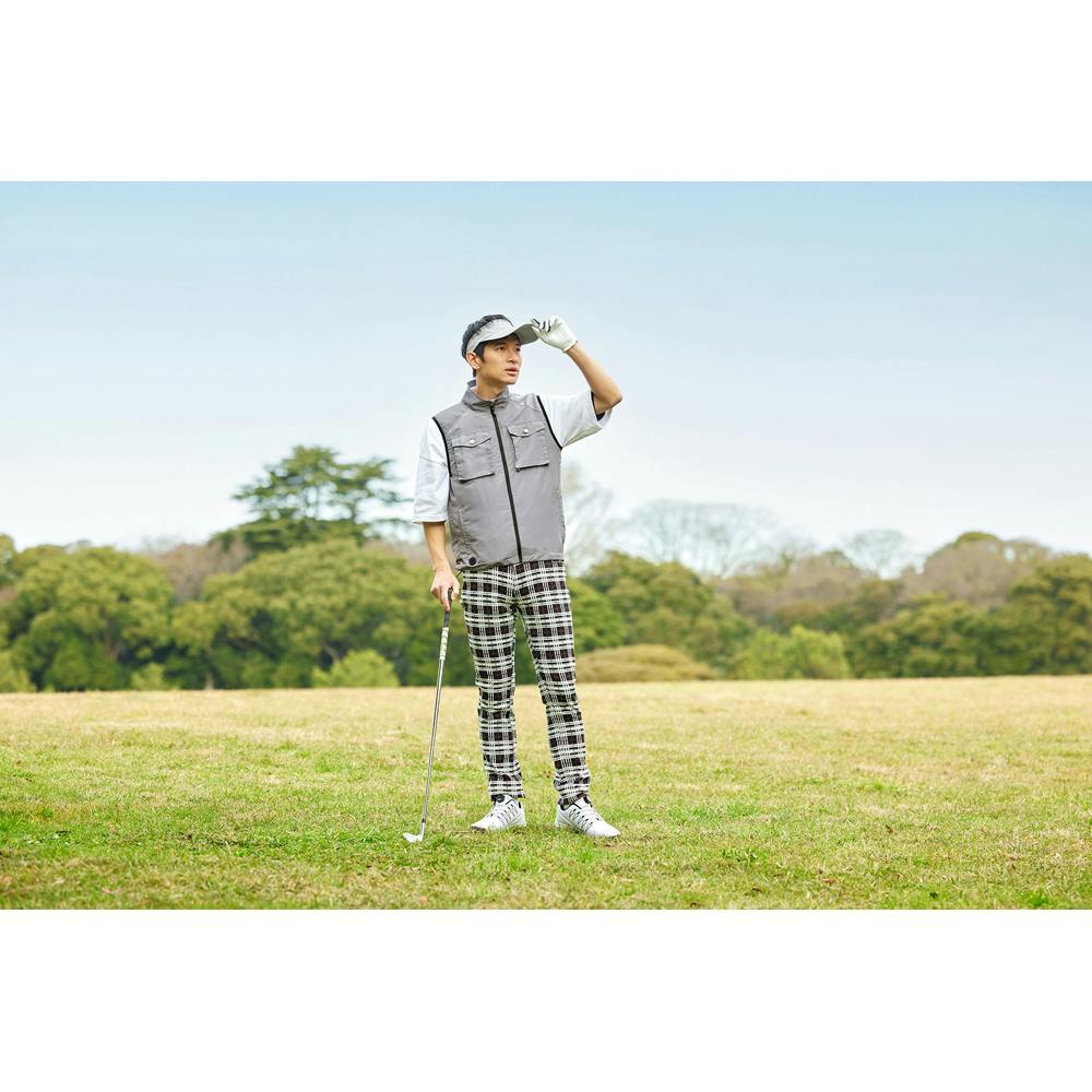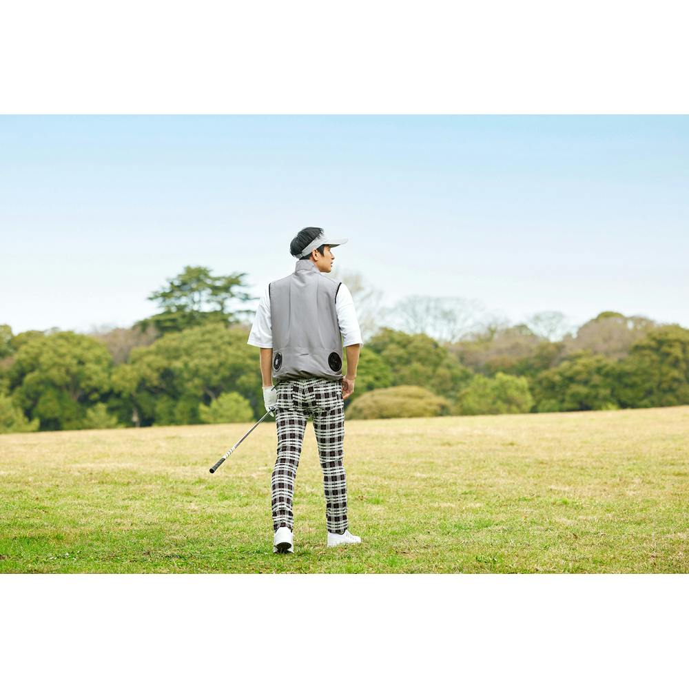 ファンから取り込んだ風が背中から首元へ抜ける立体構造です。ファンは7V出力のパワフルな送風です。9枚羽のムラの少ない風で音を抑えます。UVカット99%で、夏の日差しから守ります。腰回りは絞りが付いていて、風の抜ける量を調整することができます。押しボタン式のコントローラーで3段階の風力調節が可能です。各段階で色が変わります。ユニセックスで着用できるデザインです。