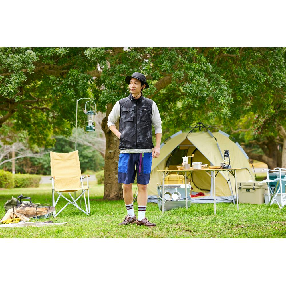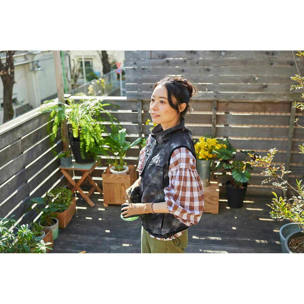 ファンから取り込んだ風が背中から首元へ抜ける立体構造です。ファンは7V出力のパワフルな送風です。9枚羽のムラの少ない風で音を抑えます。UVカット99%で、夏の日差しから守ります。腰回りは絞りが付いていて、風の抜ける量を調整することができます。押しボタン式のコントローラーで3段階の風力調節が可能です。各段階で色が変わります。ユニセックスで着用できるデザインです。