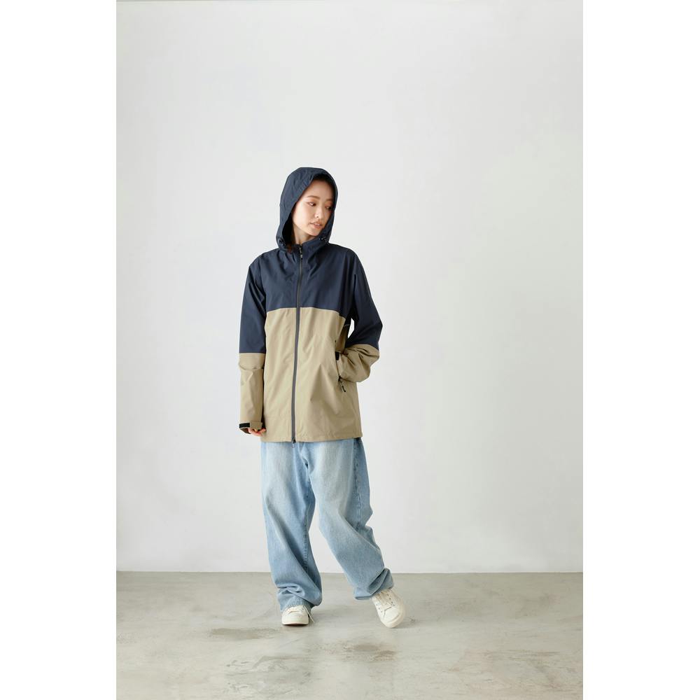 防風仕様で風を通しにくくなっています。ファスナーはすべて止水加工が施されています。フード調節のコードストッパー付きです。袖口はマジックテープで調節ができます。ファスナーポケットが左上腕部に1つ、腹部に2つ付きです。すべてスマホが収まる大きさです(※iPhone13PROの場合)。アウトドアなどマルチに活躍します。ユニセックスで着用できるデザインです。手洗い可能です。