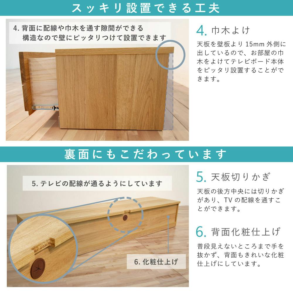 ●巾木よけ:天板を壁板より15mm外側に出しているので、お部屋の巾木をよけてテレビボード本体を壁にピッタリ設置することができます。