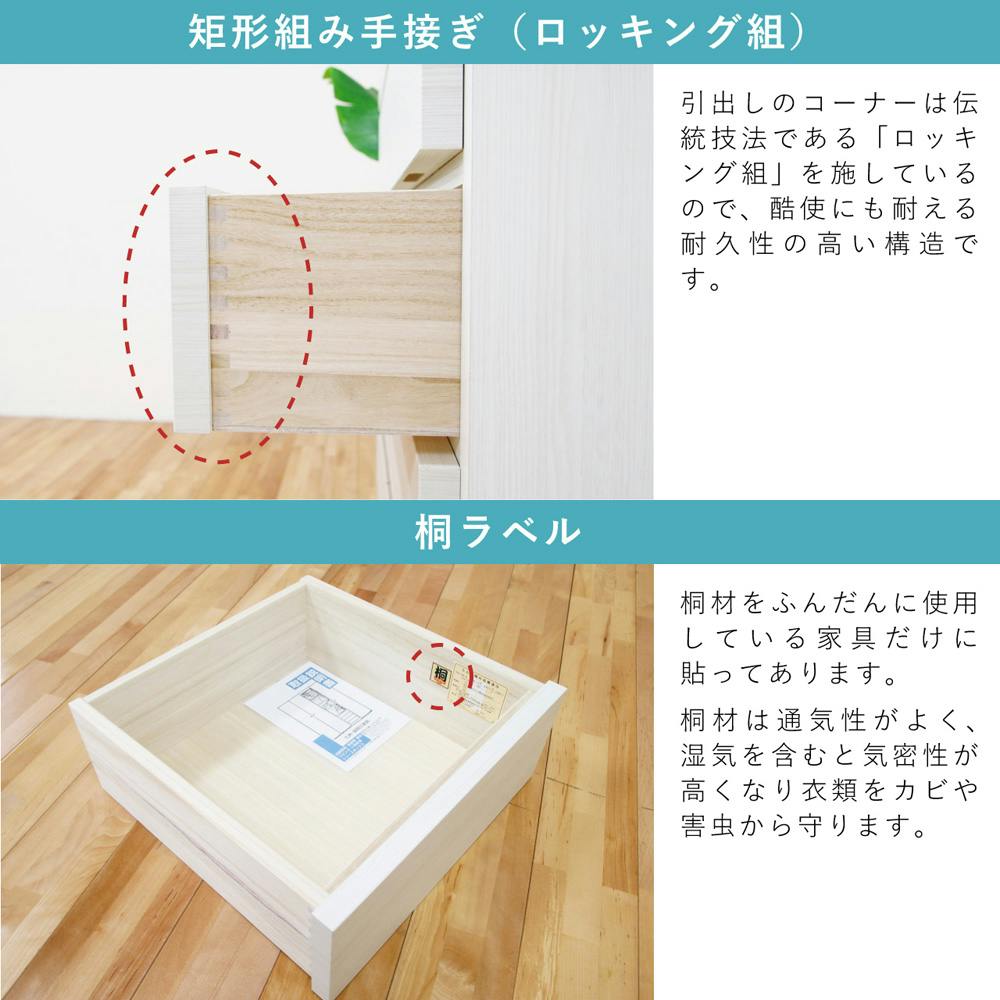 引き出しには衣類収納に最適な桐材を使用しています。桐材は通気性が良く、湿気が含まれると気密性が上がり、衣類をカビや害虫から守る効果があります。引き出しは箱組構造でロッキング組技法を施しています。長年ご使用頂ける頑丈なつくりです。