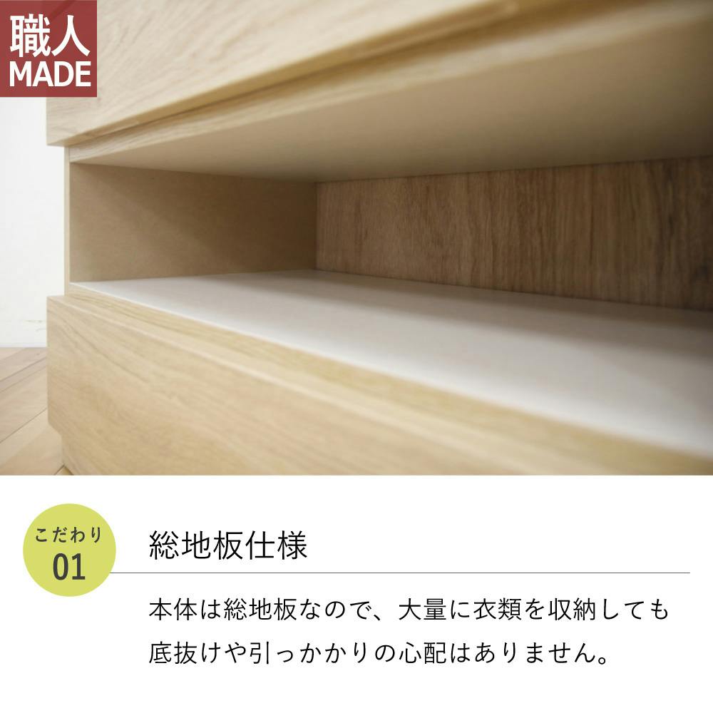 本体(ボディ)は総地板構造でしっかりとしたつくりです。大量に衣類を収納しても底抜けや引っかかりの心配はありません。地板上部は衣類を傷付けないよう、桐シート貼り加工を施しています。