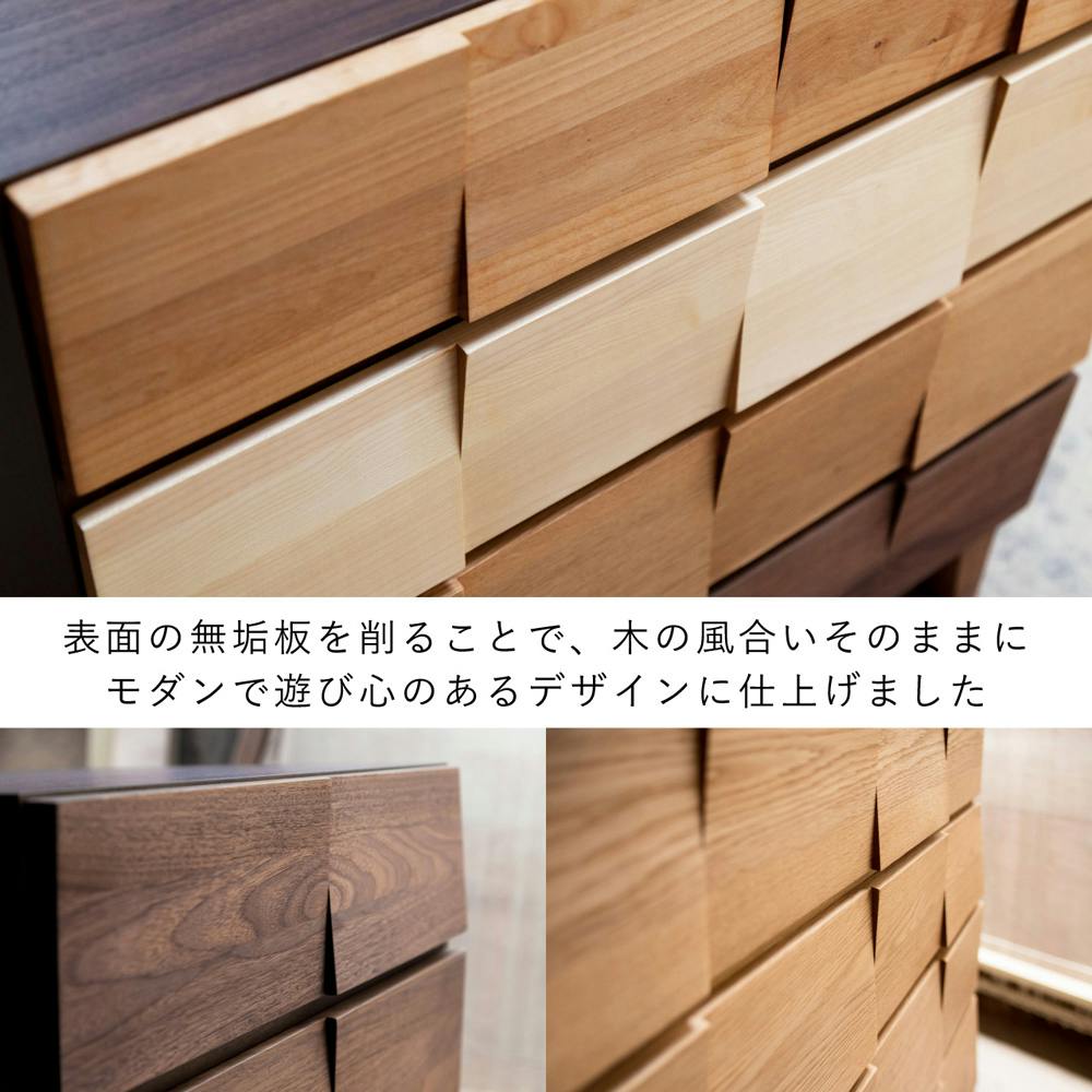 素材の質感を生かすおしゃれなデザインを考案。婚礼タンス製造に使用する機械と技術を駆使して独自の切削技術で無垢板を斜めに削り込むデザイン加工を施しています。