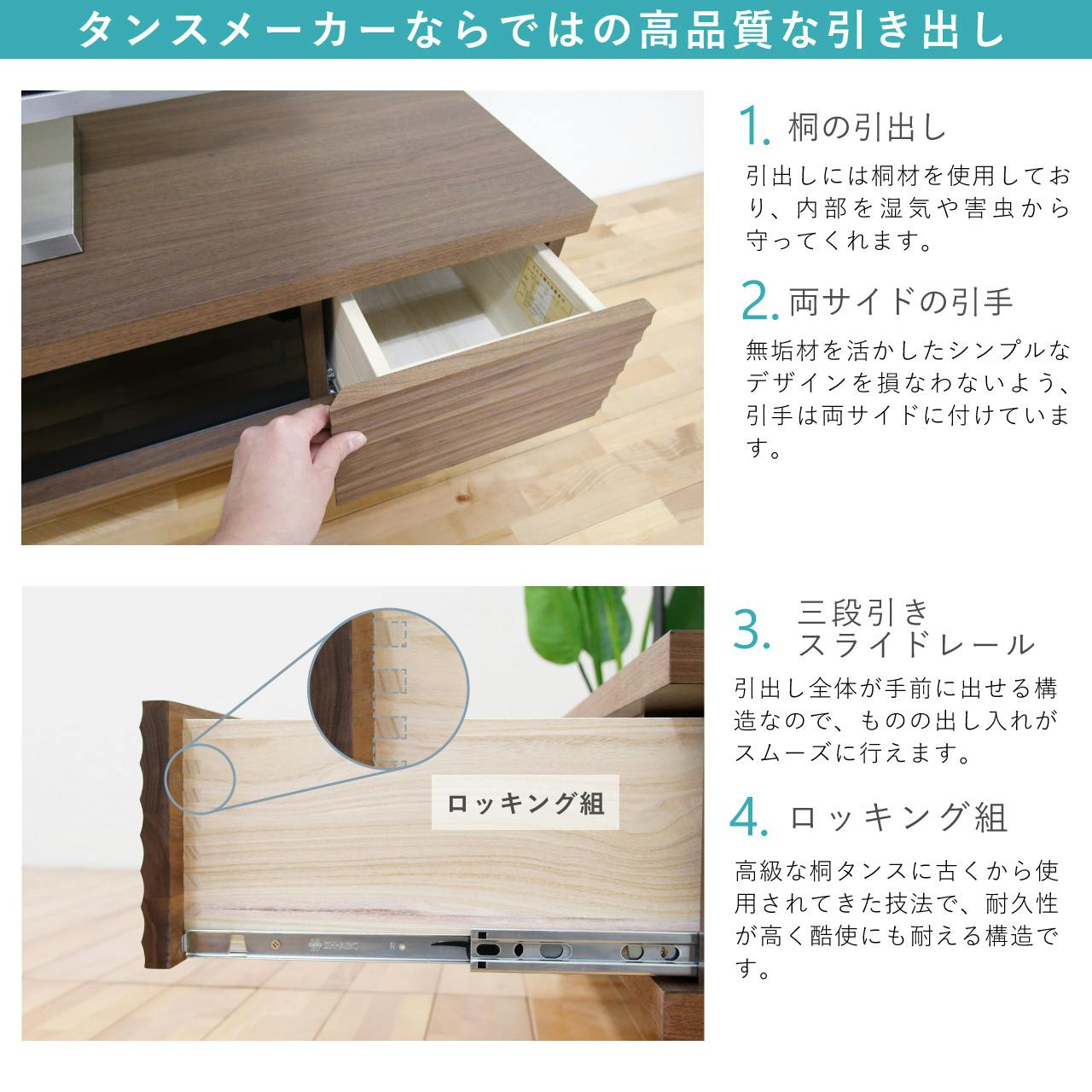 ●耐久性の高い引出し:引出しには桐材を使用しています。高級な桐ダンスに古くから使用されてきた”ロッキング組”技法を施しているので、酷使にも耐える耐久性の高い構造です。3段引きレール付きなので開閉もスムーズです。
