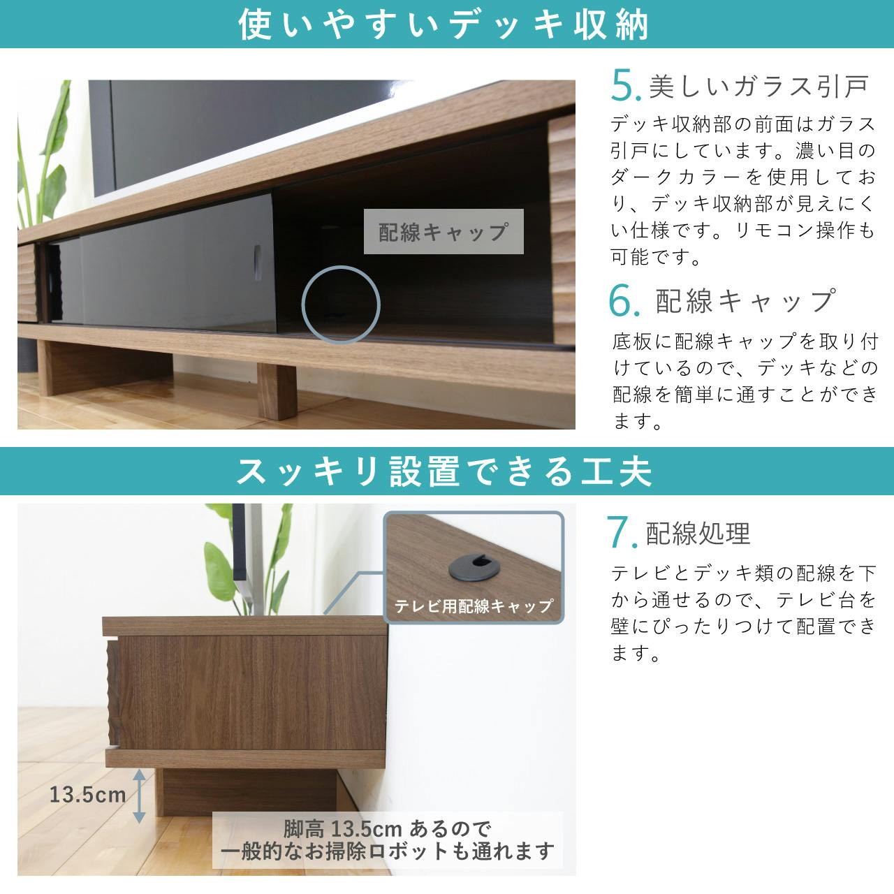 ●テレビの配線をスッキリ収納:天板とデッキ収納部には、配線を通す穴があります。配線を気にすることなく壁にピッタリとつけた状態で設置できます。