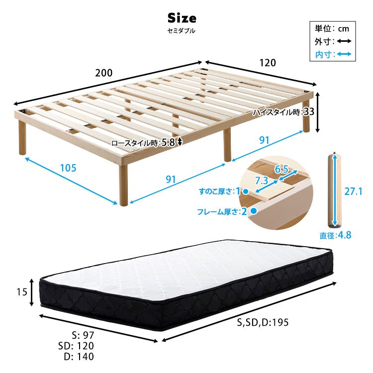 HomeTaste パイン材高さ2段階調整脚付きすのこベッド ポケットコイルマットレスセット(セミダブル) ナチュラル/ホワイト 高さ変更可能 まとめ買い フレームのみ ASP-SRM-SD--NAWH【別送品】
