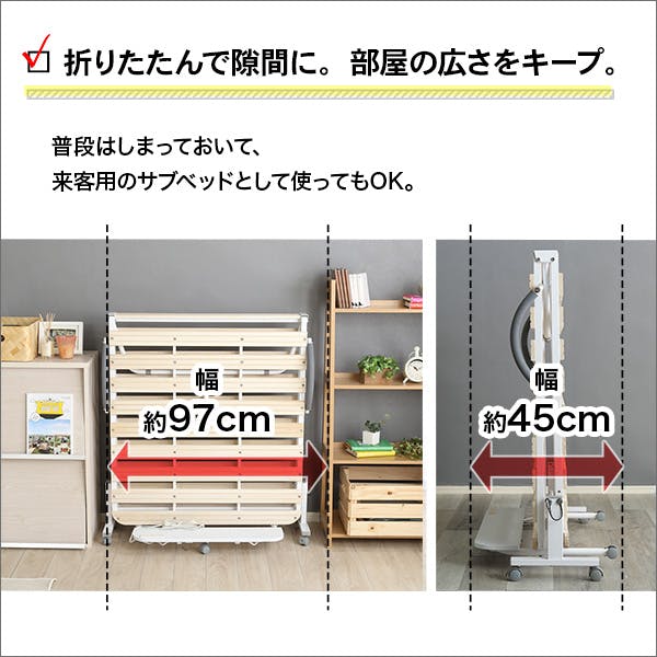 宮棚とコンセントが付いた折りたたみすのこベッド!吸湿に優れた天然桐すのこ材を使用!布団を乗せたまま折りたためるのもポイントです。キャスター付きだから移動もラクラク♪