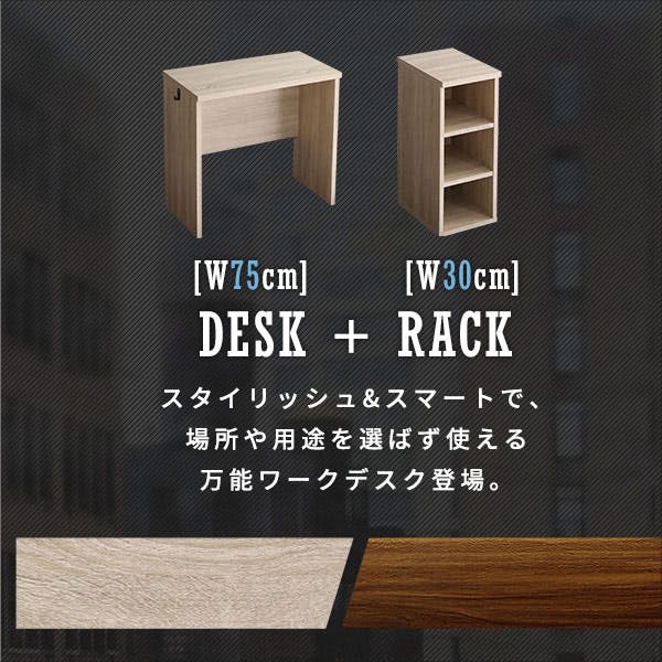 子どもから大人まで使えるリビングに合うヴィンテージシンプルデスクセット75cm幅、ラックは30cm幅!教科書&ノートを広々置ける学習机に!趣味や家事のワークスペースとしても使えます!収納力もプラスしたい方にはラックがおすすめです!奥行・高さは共通なので、どの幅(60、75、90cm幅)のデスクにもピッタリ合います。便利な3段可動棚で入れたいものに合わせて棚を調整できます。しっかりした厚みの天板はキズや書き跡に強いPVC仕様です。
