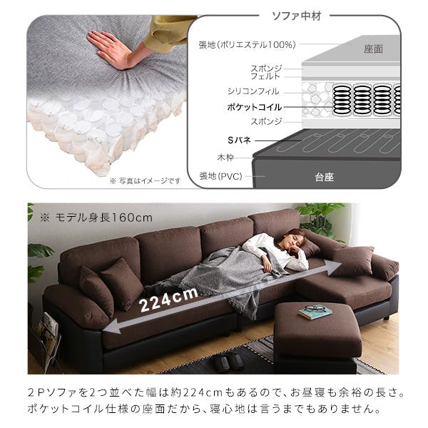 レイアウトバリエーションが豊富なファブリック×PVCレザーの6人掛けカウチソファ!座面に優れた弾力性と耐久性のポケットコイルを採用しております。丸洗いができるファブリック製カバーリングでいつも清潔に保つことができます。さらっとした肌触りでオールシーズン快適です。PVCレザーは丈夫で耐久性があるので、汚れても拭くだけでOKです。オットマンを使用せずお昼寝もゆったりできる余裕の広さです。