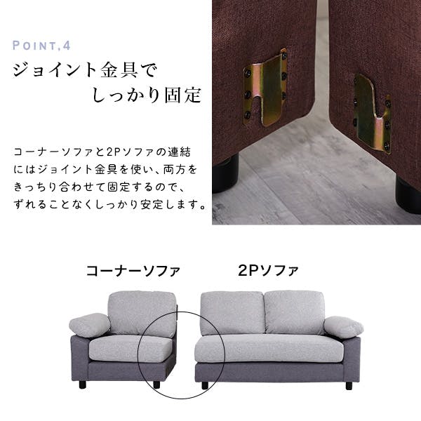 レイアウトバリエーションが豊富なファブリックのカウチソファ!組み換え自由な4つのソファは、座面に優れた弾力性と耐久性のポケットコイルを採用しております。丸洗いができるファブリック製カバーリングでいつも清潔に保つことができます。さらっとした肌触りでオールシーズン快適です。コーナー&2Pソファを並べると、お昼寝もゆったりできる余裕の広さです。