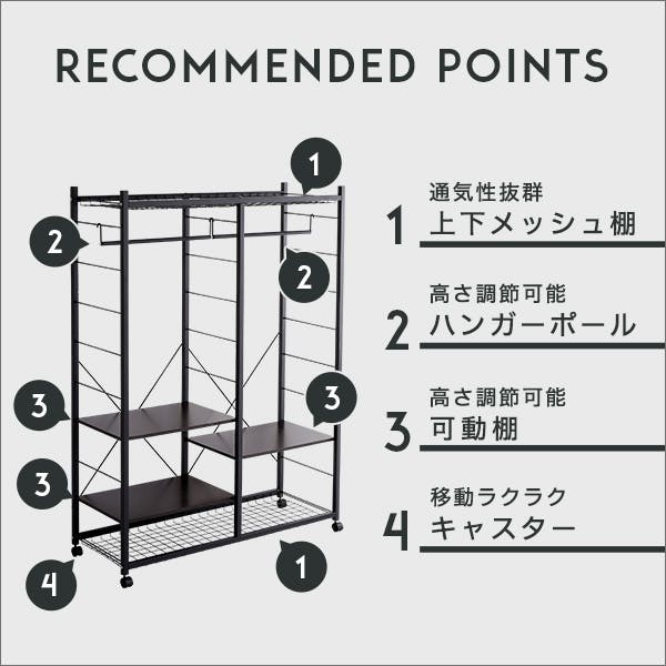木の温かみととブラックスチールの美しいコントラストが映えるデザインハンガーラック119cm幅!お部屋にお洒落なアクセントが欲しい、衣類の収納にこだわる方へ特にオススメ!通気性抜群上下メッシュ棚・高さ調節可能ハンガーポール可動棚・移動楽々ストッパーキャスター付き!ポールと棚板は簡単に外せて自由に付け替え可能!高さ調節可能なので子供部屋からおしゃれリビングまで自由自在に使えます!