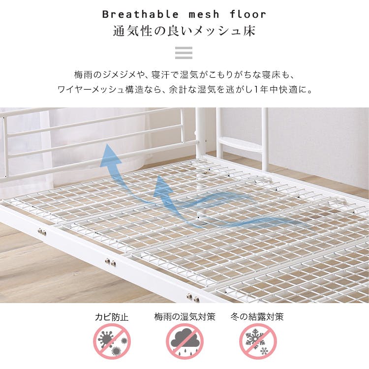 並べて連結もできる パイプ2段ベッド!上下を分割することができ、シングルベッドや、連結してキングベッドとしてもお使いいただけるので、お子様の成長やライフスタイルの変化に合わせて長くお使いいただけます。サイドにワイヤーを付けなくても頑丈な作りになっていますので、見た目もすっきりとしていてスタイリッシュです。上段には両方にサイドフレームがありますので、落下することはありません。壁傷防止のネジ頭キャップが付いていますので、賃貸でも安心してお使いいただけます。