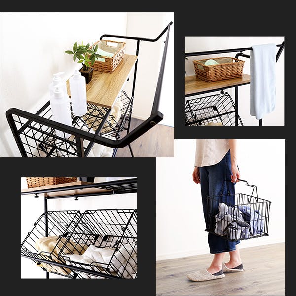 ヴィンテージ ランドリーラック バスケットタイプ!幅は65cmから90cmまで無段階に調整できるので大型洗濯機にも対応できます。洗濯物を一時的にかける時に便利なハンガーバーが付いています。棚板裏面には、ズレ落ち防止ストッパーが4つ付いているので、万が一の落下を防ぎます。持ち運びできる取っ手付きのバスケットが2個付き!棚とバスケットの高さは12段階調整可能です。