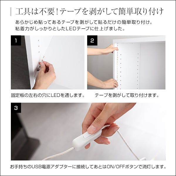 ※本商品は「LED」ライトのみの販売ページとなっております。コレクションラック本体は別売りとなります。電源アダプターは付属しておりません。ご注意ください。・LEDを取り付けて圧巻のコレクションラックに!・コレクションの見栄えが格段によくなります。・コードが邪魔にならない専用設計!・工具は不要の簡単取り付け・便利なUSB接続!