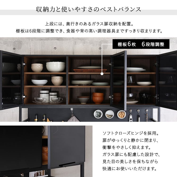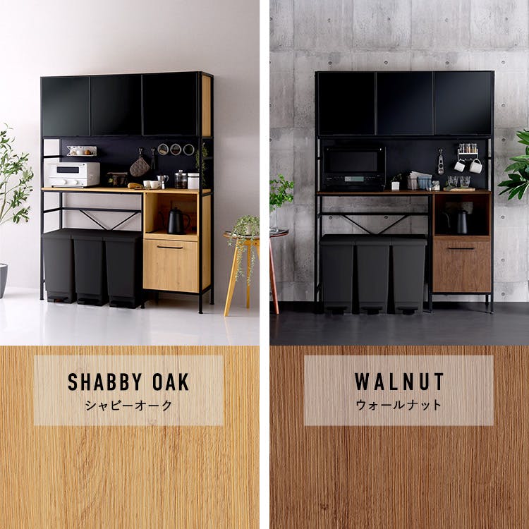ヴィンテージなワイドタイプのゴミ箱上ラック食器棚!上段のガラス扉はブラックのスモークガラスなので高級感があります。背板はマグネットになっているので、市販のマグネット収納を取り付けてお好みでカスタマイズできます。上段の収納扉にはソフトクローズのヒンジを採用しています。スライド棚には2口コンセントが付いているので、炊飯器やレンジをおいてもOK!