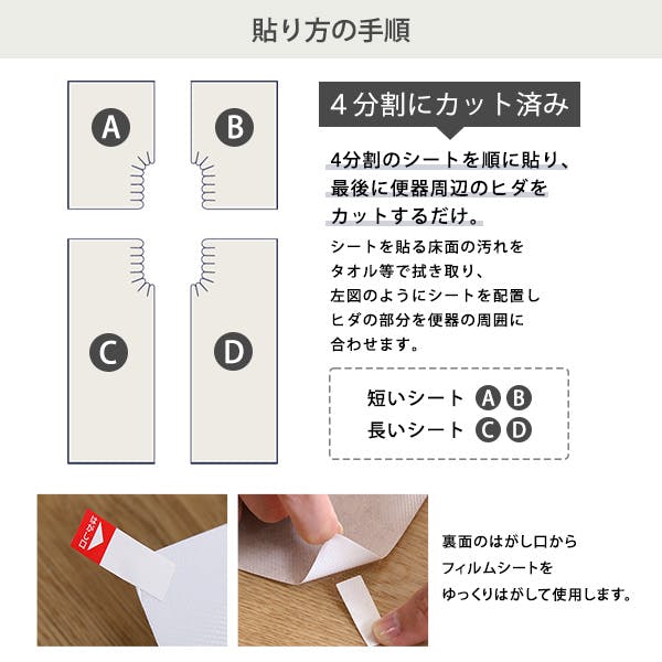 DIYをお手軽に楽しめる貼り直し可能なトイレ模様替えシート!何度でも貼り直しができる素材ですので、きれいに仕上げることができます!4つに裁断済なので、難しいカーブなども簡単に貼り付けられます!表面は防水加工なのでお手入れも簡単、清潔にご利用頂けます!きれいに剥がせるので賃貸物件の退去時にも、簡単現状復帰!