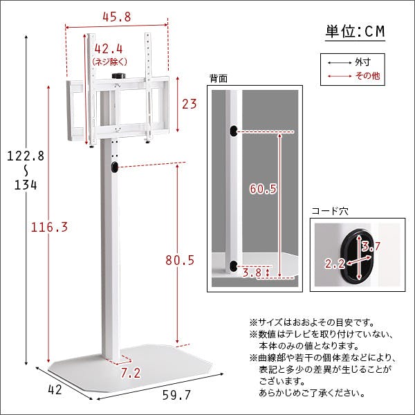 テレビスタンド:W約59.7×D約42×H約122.8-134cmHDDホルダー:W15×D6.1×H10cm