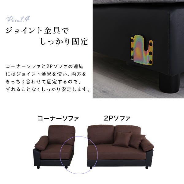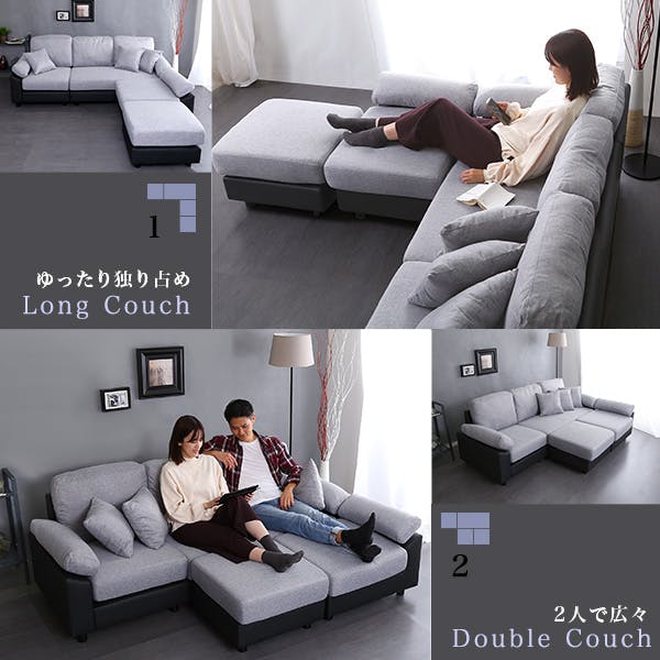 レイアウトバリエーションが豊富なファブリック×PVCレザーのカウチソファ!組み換え自由な4つのソファは、座面に優れた弾力性と耐久性のポケットコイルを採用しております。丸洗いができるファブリック製カバーリングでいつも清潔に保つことができます。さらっとした肌触りでオールシーズン快適です。PVCレザーは丈夫で耐久性があるので、汚れても拭くだけでOKです。コーナー&2Pソファを並べると、お昼寝もゆったりできる余裕の広さです。