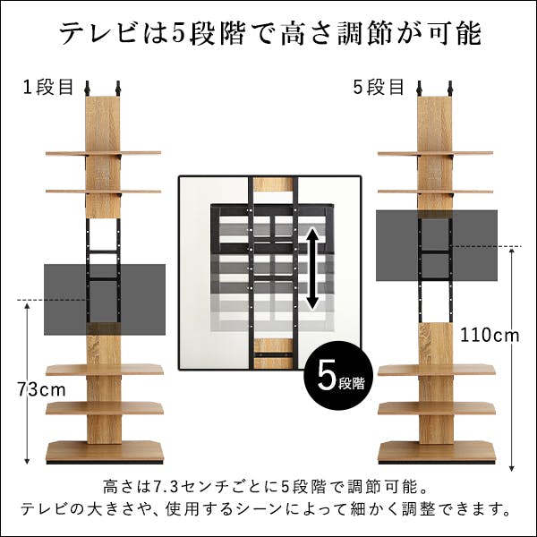 ディスプレイ収納が出来る突っ張りテレビスタンド。設置には穴あけが不要なので、天井と床でしっかり固定でき、賃貸住宅でも安心してお使い頂けます。テレビの上のデッドスペースをオシャレに有効活用できます。テレビ位置は5段階調整ができますので、お好みの高さに設置できます。幅60cm、奥行35cmなので、お部屋をスッキリみせることができます。可動棚にはAV機器や小物雑貨を置いてオシャレに魅せる収納を楽しめます。テレビは32~60インチまで対応です。