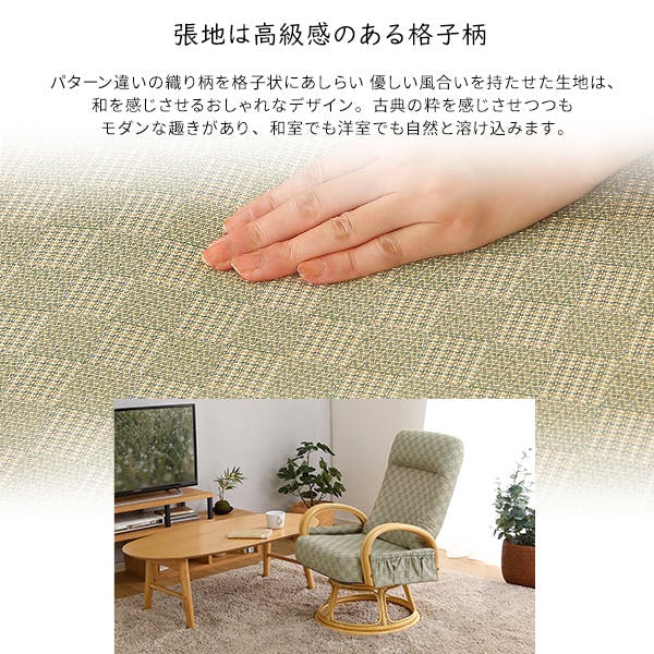 旅館のような寛ぎ腰掛けしやすい回転高座椅子!背もたれは3段階リクライニング可能でお好みの姿勢でご使用いただけます座ったまま360度回転するので、楽に向きを変更でき、後ろのものにも簡単に手が届きます手元においてすぐとれる便利なサイドポケット付き脚部と肘掛けには自然の風合いが美しいラタン(籐)、座面は座り心地がよいウレタンフォームを使用カラーは選べる2色展開!