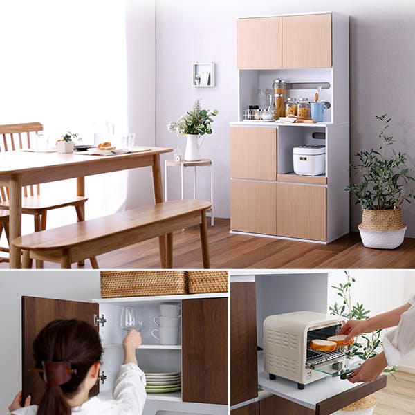 スリム設計の大容量79cm幅の食器棚です!コンパクトながら食器やストック商品など、たっぷり収納できます。オープンスペースはちょっとした作業台としてお使い頂けます。スライドトレーとオープンスペースには通気孔があるので、熱や蒸気を逃がします。上下の棚は可動式なので、食器や食品ストックをきれいに収納できます。便利な2口コンセントが付いているで炊飯器やキッチン家電を収納できます。高さ163cmなので、小柄な女性でも無理なく収納できます。