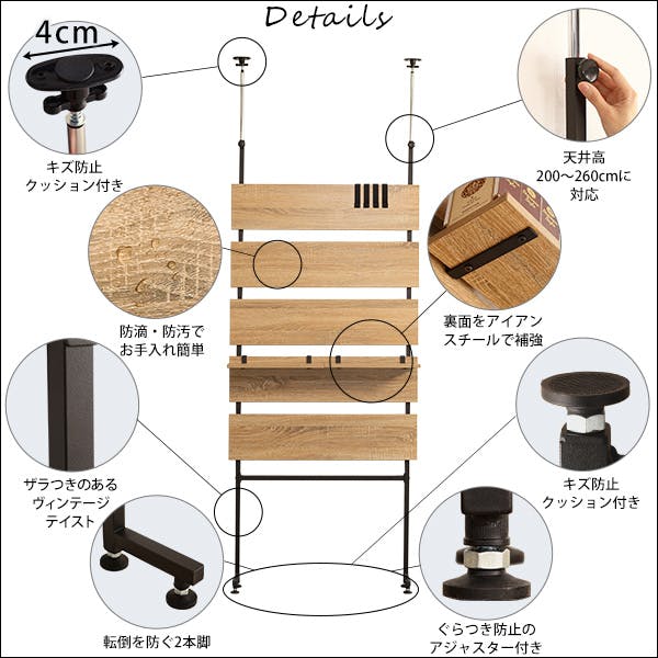 木目の棚板とブラックスチールが美しいヴィンテージテイストのラダーラック80cm幅。お部屋の目隠しや付属の棚を使い小物を置いたりと様々な使用用途で便利です。つっぱり式なので、地震などの揺れの際に倒れにくい安心設計。壁に穴を開けることがないので賃貸でも安心です。