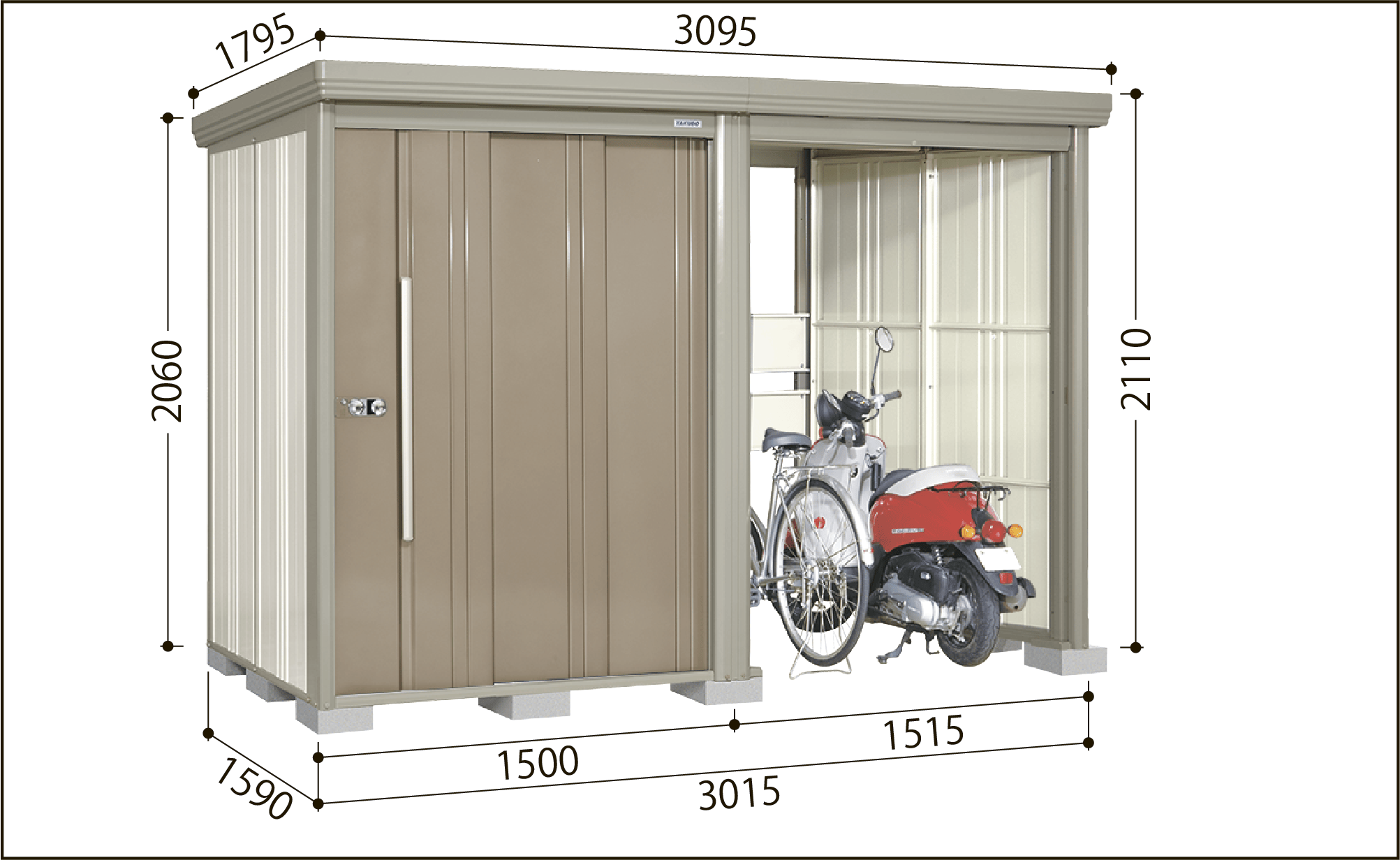 ■連動吊り戸を採用し、開閉が軽くて静か。■耐久性と滑りに配慮したアルミレールを採用。■頑丈で安心の柱構造を採用。■軒樋、縦樋を標準装備。■安心と便利の2ロックシステム錠を採用。■扉の合わせ目の形状を工夫し、雨水や埃の侵入を防ぎます。■調節が簡単で丈夫な棚。■錆びに強い高級焼付塗装を採用。■庫内の空気を対流させる換気口付。■ボルトで固定された安心の床板。■便利なアルミフック3個やコードホール付。